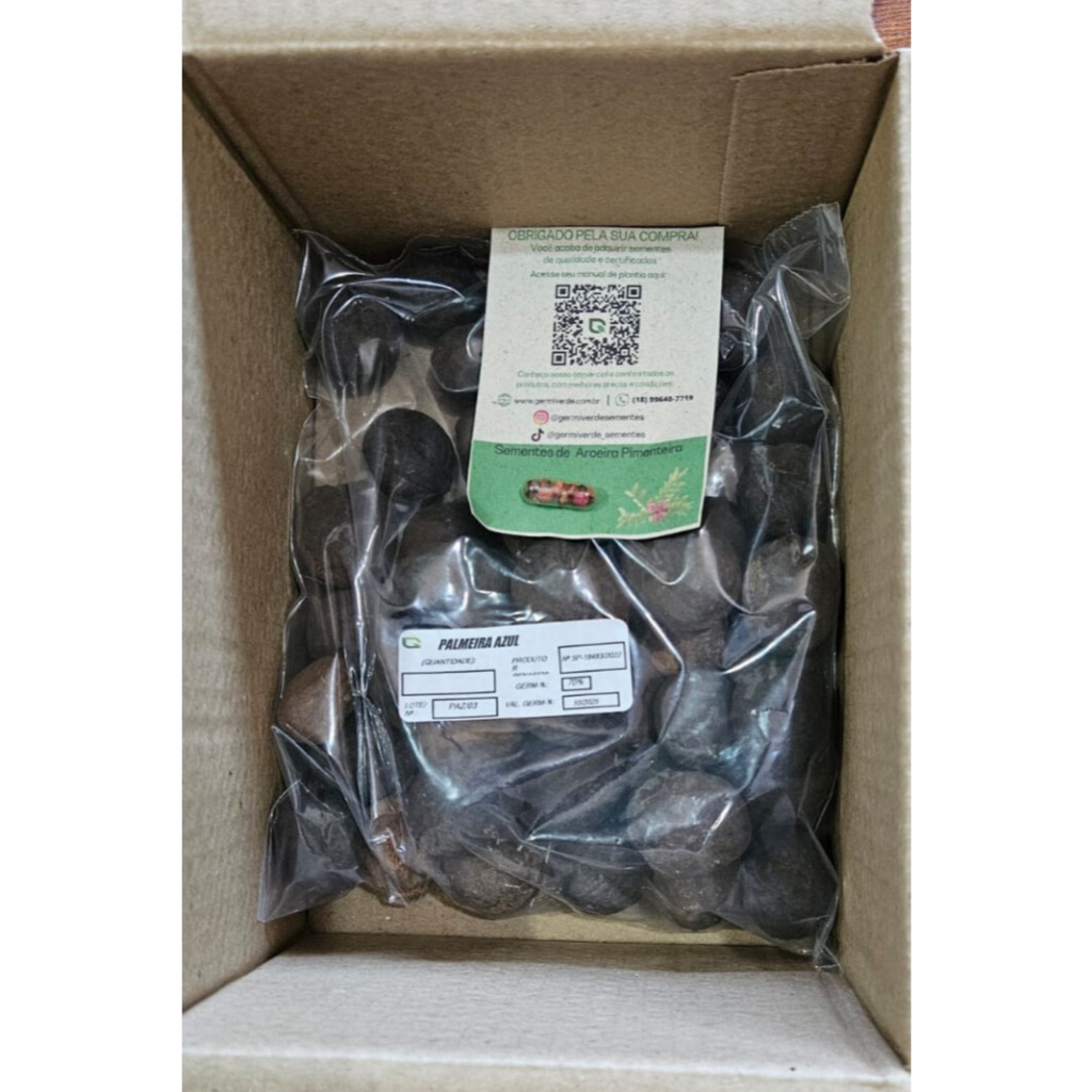 Caixa com 20 unidades de sementes Sementes frescas e de Alto Vigor. Sementes armazenadas em câmara fria para garantir a viabilidade. Nome Científico: Bismarckia nobilis Sinonímia: Medemia nobilis Nomes Populares: Palmeira-azul, Palmeira-bismarckia, Palmeira-de-bismarck Família: Arecaceae Categoria: Palmeiras, Plantas Esculturais Clima: Equatorial, Mediterrâneo, Subtropical, Tropical Origem: Madagascar Altura: acima de 12 metros Luminosidade: Meia Sombra, Sol Pleno Ciclo de Vida: Perene Esta palmeira apresenta estipe único, com diâmetro entre 30 a 45 cm, e alcança 25 metros de altura, embora geralmente não ultrapasse 12 metros. As folhas são grandes, eretas, cerosas, em número de 15 a 20, com formato de leque, palmadas, de cor azul prateada e sustentadas por fortes pecíolos. Quando as folhas velhas caem, deixam uma marca no tronco, que fica anelado. Ocorre ainda uma variedade de folhas verdes, que é menos resistente ao frio e à seca. A floração ocorre na primavera, despontando inflorescências interfoliares, pendentes, ramificadas e com numerosas flores de cor marrom. As flores são menores e mais abundantes nos machos do que nas que fêmeas. Para produzir sementes férteis é necessário ter as plantas dos dois sexos próximas para que a polinização ocorra. Os frutos são do tipo drupa, ovóides e de cor marrom escura a preta quando maduros. Cada fruto contém uma única semente. De uma beleza espetacular, essa palmeira exótica é avidamente procurada por paisagistas e entusiastas para suas composições. Seu efeito é escultural e impactante, tornando-se invariavelmente, um ponto focal no jardim. E o mais interessante, é que a planta jovem já é capaz deste efeito, pois sua copa é bastante ampla mesmo com pouca altura. Ideal para jardins amplos, contemporâneos ou tropicais. Também pode ser cultivada em grupos ou linhas, com excelente efeito. Para o seu desenvolvimento e apreciação, precisa de espaço de no mínimo 8 metros de diâmetro. A mesma medida deve ser tomada para espaçamento entre mudas. Deve ser cultivada sob sol pleno, em solos bem drenáveis, enriquecidos com matéria orgânica e irrigados regularmente. Após o pleno estabelecimento é capaz de tolerar períodos de estiagem. Mesmo assim, recomenda-se a irrigação suplementar, que estimula o rápido crescimento desta espécie. Ao contrário da maioria das palmeiras, a palmeira-azul pode ser conduzida sob sol pleno mesmo que seja jovem.