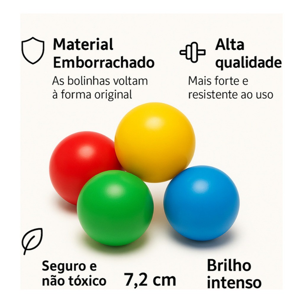 Bolinhas para Piscina – 72 mm – Kit com 200 Unidades – Coloridas – PLANETA DAS BOLINHAS Diversão segura, colorida e cheia de alegria para ambientes infantis. As bolinhas de 72 mm são ideais para piscinas de bolinhas, brinquedotecas, playgrounds, festas infantis e diversos espaços recreativos. Produzidas em polietileno resistente e material atóxico, garantem segurança, durabilidade e muito entretenimento para as crianças. Leves e resistentes, mantêm seu formato mesmo após uso frequente, sendo uma excelente opção tanto para uso doméstico quanto profissional. Características do Produto: • Diâmetro: 72 mm • Material: Polietileno resistente e atóxico • Cores variadas (envio sortido) • Leves e duráveis • Mantêm o formato mesmo com uso contínuo • Não afundam em líquidos • Fácil higienização Indicações de Uso: • Piscinas de bolinhas • Brinquedotecas • Playgrounds • Festas e eventos infantis • Espaços recreativos • Uso residencial ou profissional (buffets, escolas, espaços kids) Benefícios: • Estimulam a diversão e interação das crianças • Material resistente para uso frequente • Produto leve e seguro • Fácil de limpar e armazenar • Cores vivas que deixam o ambiente mais alegre Conteúdo da Embalagem: • 200 bolinhas coloridas de 72 mm (cores variadas) Observação: As cores podem variar conforme o lote de produção, podendo ocorrer pequenas diferenças de tonalidade sem alterar a qualidade do produto.