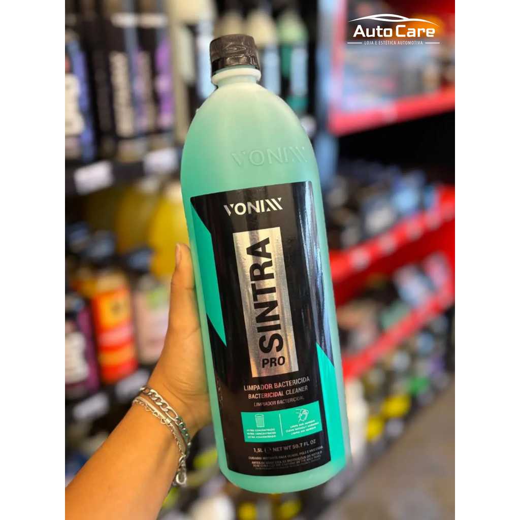 Sintra Pro – Multilimpador Flotador Bactericida Ultra Concentrado 1,5L | AutoCare O Sintra Pro é um multilimpador flotador bactericida de alta performance, desenvolvido para a limpeza profunda de interiores automotivos. Com fórmula alcalina, pH balanceado e ultra concentrada, é indicado para painéis, portas, couro, carpetes e estofados, promovendo a remoção eficaz de manchas de gordura, sujeiras diversas e microrganismos causadores de doenças. Sua baixa espumação o torna ideal para uso com extratoras e tornadores, facilitando a higienização sem agredir os materiais. Além de limpar, o Sintra Pro reduz maus odores, deixando o interior do veículo mais saudável e livre de impurezas. Principais Benefícios: Alto poder de limpeza e desengorduramento Elimina microrganismos e reduz odores Ultra concentrado — alto rendimento Compatível com extratoras e tornadores Ideal para painéis, couro, carpetes e estofados Não recomendado para aplicação em vidros automotivos Diluição Recomendada: Laterais de portas, plásticos e couro muito encardido: 1:15 Carpetes, estofados e teto: Sujeira pesada: 1:10 Sujeira média: 1:20 Sujeira leve: 1:30 Manutenção de limpeza interna: 1:50 Uso em extratoras: até 1:60 Uso com tornador: 1:10 Modo de Uso: Em painéis, portas e bancos de couro: Diluir o produto conforme a indicação Aplicar com pulverizador na área desejada Esfregar com pincel, escova macia ou aplicador de espuma em movimentos circulares Remover o excesso com toalha de microfibra úmida Em carpetes, estofados e tecidos: Diluir o produto conforme a indicação Aplicar com pulverizador na área desejada Esfregar com escova macia ou aplicador de espuma Utilizar aspirador específico para remoção de água Aguarde a secagem completa Informações Adicionais: Produto alcalino Não aplicar em vidros automotivos Precauções: Produto não comestível Evite contato prolongado com a pele Lave as mãos após o uso Mantenha fora do alcance de crianças e animais domésticos Leia atentamente o rótulo antes de utilizar Dica AutoCare: Use o Sintra Pro como parte da rotina de higienização interna para manter o veículo limpo, livre de odores e protegido contra agentes nocivos.