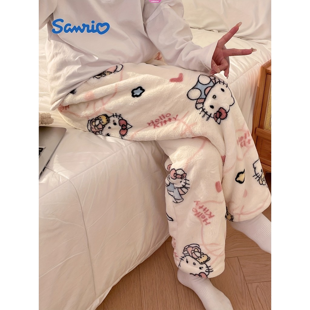 2025 Nova Sanrio Hello Kitty Calça Pijamas Anime Casual Duplo Elástico Flanela Calças Macias Feminino Dos Desenhos Anima