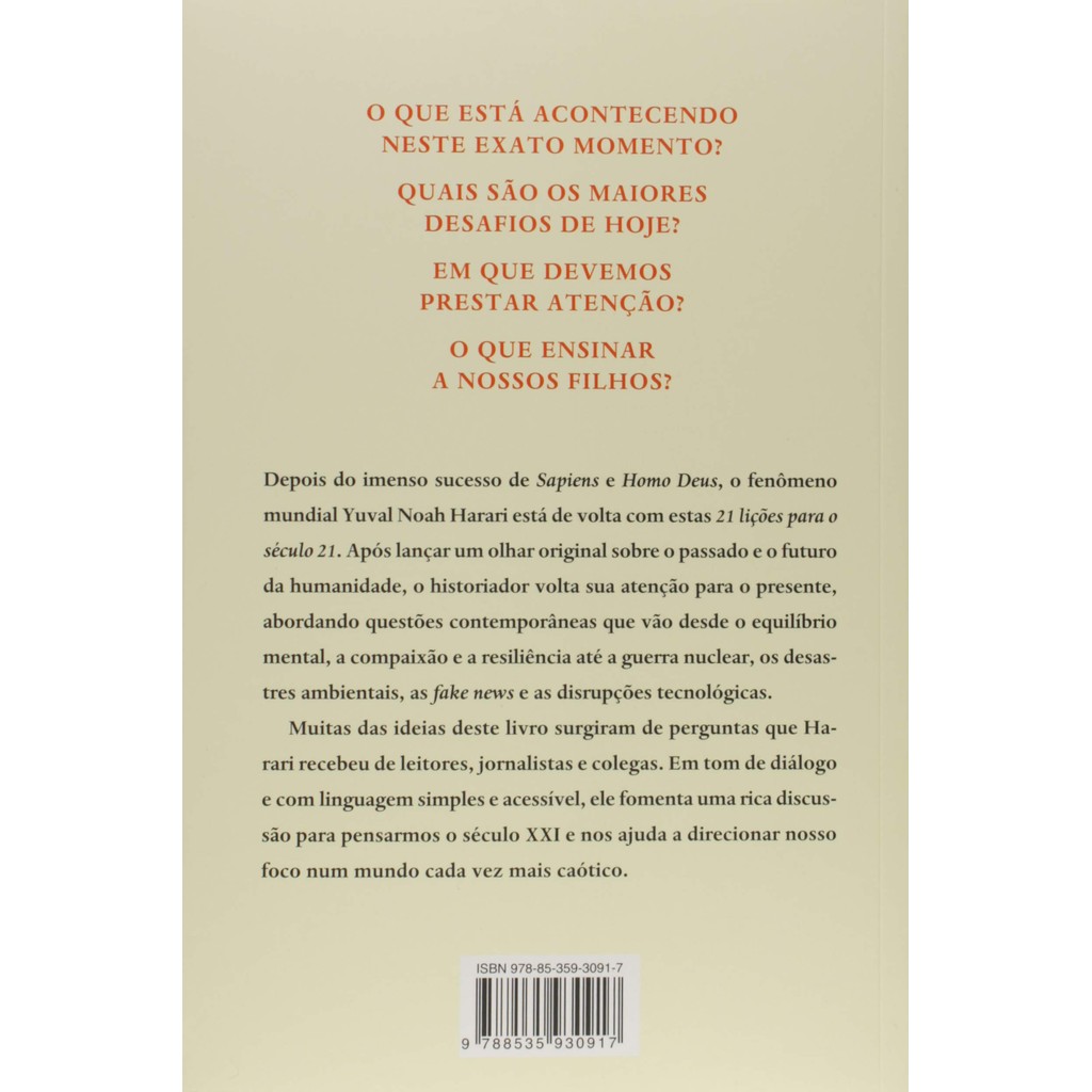O novo livro do autor de Sapiens e Homo Deus explora as grandes questões do presente e o que podemos fazer para melhorá-lo. Como podemos nos proteger de guerras nucleares, cataclismos ambientais e crises tecnológicas? O que fazer sobre a epidemia de fake news ou a ameaça do terrorismo? O que devemos ensinar aos nossos filhos?Em Sapiens, Yuval Noah Harari mostrou de onde viemos; em Homo Deus, para onde vamos. 21 lições para o século 21 explora o presente e nos conduz por uma fascinante jornada pelos assuntos prementes da atualidade.Seu novo livro trata sobre o desafio de manter o foco coletivo e individual em face a mudanças frequentes e desconcertantes. Seríamos ainda capazes de entender o mundo que criamos?