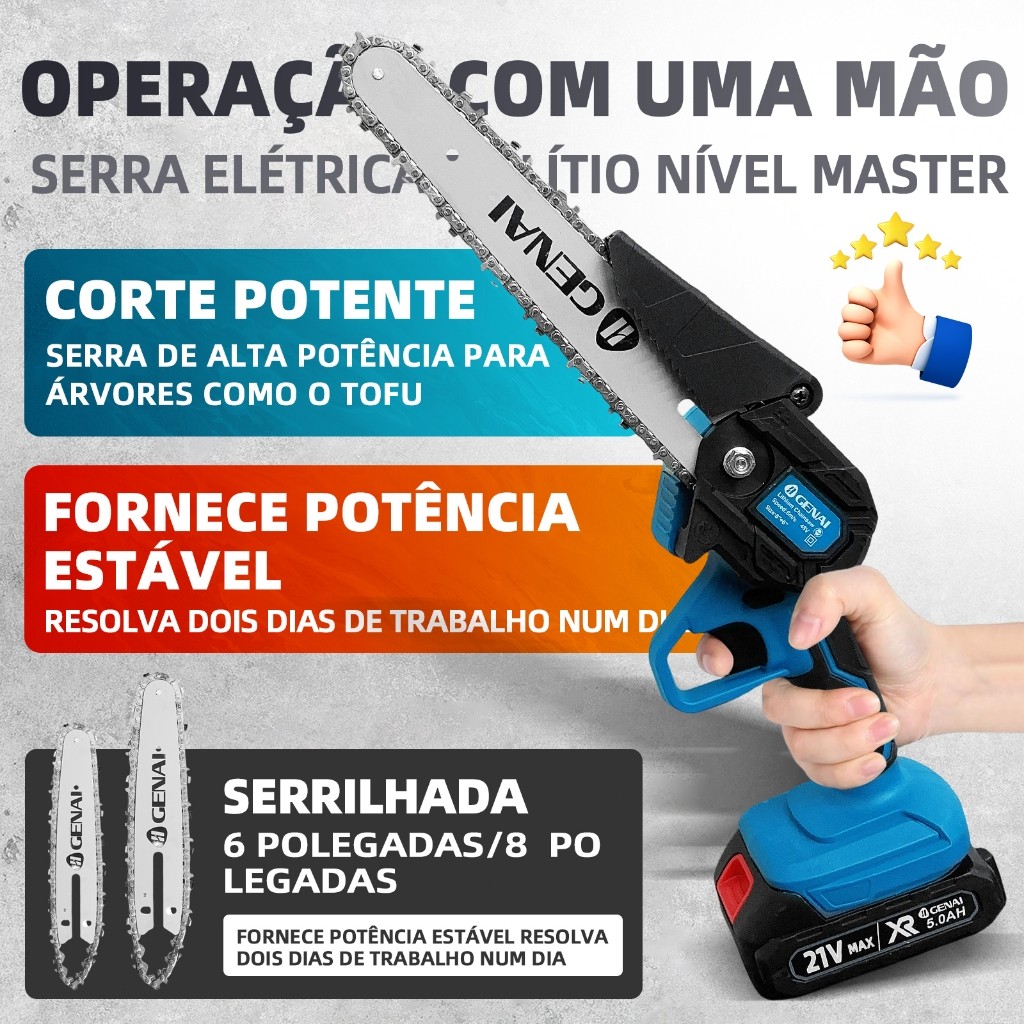 Serra Elétrica de Poda Recarregável Bateria de lítio 21V, Carpintaria, Serra com uma mão para Troncos de Jardim Ferramental versátil ideal para cortes e podas, melhore sua comodidade ao serrar, podar em qualquer lugar, faça cortes em galhos em lugares de difícil acesso. Utilize a com a praticidade de se mover sem arrastar fios. Fácil de usar: corpo leve e conveniente, design leve, mãos longas e sem cansaço. Tamanho pequeno, pode ser segurado com uma mão. Alta eficiência: com motor de cobre puro, velocidade rápida, potência forte e corte rápido, melhore sua eficiência de corte. Bateria 21V Lítio 1500mah Potência: convertida aproximadamente 1500 W Material: Plástico ABS Cor: azul Comprimento do sabre: 24Cm Itens Inclusos: - 1 Serra elétrica - 2 Bateria de lítio 21v - 1 Chave L - 1 Chave de fenda - 1 Carregador Bivolt - 1 6 polegadas Lâminas de serra - 1 8 polegadas Lâminas de serra Atenção! utilizar sempre óleo para corrente de motosserra para facilitar o corte e aumentar a vida útil do produto.