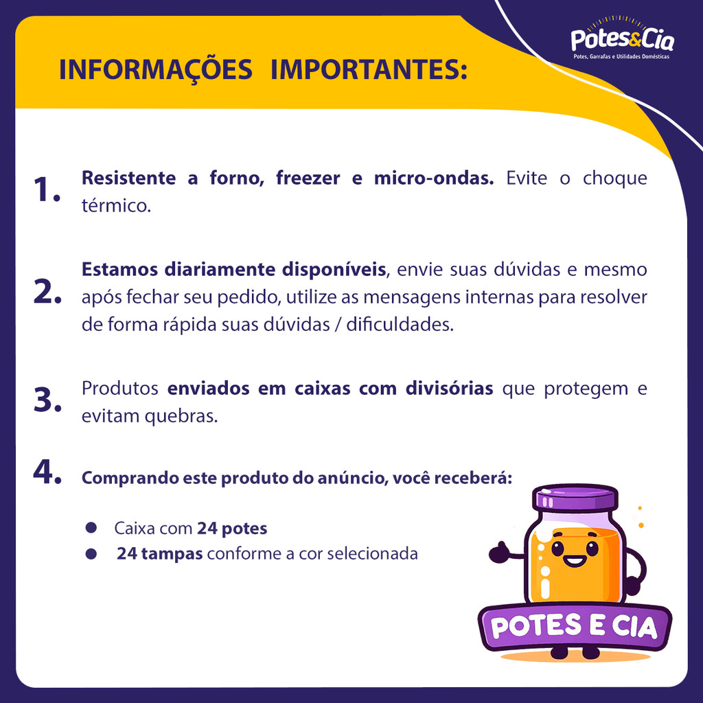 POTES & CIA - Potes, Garrafas e Utilidades Domésticas em Vidro CONTEÚDO DA CAIXA: - 24 unidades de Pote de vidro Liso de 200ml - 24 unidades de Tampa plástica conforme cor selecionada DESCRIÇÃO / INFORMAÇÕES TÉCNICAS DO PRODUTO: - Capacidade útil: 200ml - Cor: Transparente/Incolor - Altura: 120mm - Diâmetro (Máximo): 53mm - Tampa: Plástica - Peso: 142grs - Peso Caixa: 3,5 Kg **** INFORMAÇÕES IMPORTANTES: **** >> EMBALAGEM - A caixa está preparada para logística com separadores entre os potes, dificultando a quebra dos itens no envio. >> AVARIAS/DIVERGÊNCIAS - Caso aconteça avarias ou divergências com o pedido, orientamos entrar em contato com nosso SAC através do campo de mensagens, não sendo necessário a abertura de RECLAMAÇÕES. Fique tranquilo pois temos uma política de análise e resolução rápida destes tipos de problemas para que fique satisfeito com sua compra e com nosso atendimento. >> FRETE - Nossos pedidos são enviados diariamente para garantir rapidez e segurança no transporte de sua mercadoria; No dia seguinte ao envio o sistema irá liberar o código de rastreamento e você conseguirá acompanhar a sua entrega via sistema. ** OBSERVAÇÕES: ** - NÃO é possível alterar a cor da tampa após finalização do pedido. - NÃO é possível misturar as cores das tampas. >> ORIENTAÇÕES DE USO: - Os potes de vidro devem ser esterilizados em água fervendo; - Para conservar os aspectos e garantir a durabilidade do produto: limpar com água e detergente neutro. Não usar solventes ou produtos abrasivos. - Caso coloque o produto sob baixas temperaturas, deixe espaço para dilatação do produto, evitando assim risco de rachar; - O pote possui grande resistência à altas temperaturas, podendo ser levado ao micro-ondas, forno, dentre outros. Evite o choque térmico. - Para aplicação do lacre termo retrátil, recomendamos utilizar um soprador térmico, sendo também possível colocar com o ar quente de um secador de cabelo. Agradecemos sua visita e permanecemos à disposição no chat abaixo para lhe atender da melhor forma!!