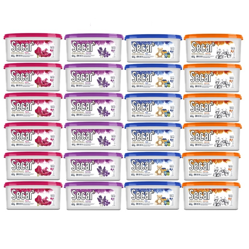 O Secar Natural é um Evita Mofo que age eliminando a umidade, evitando os problemas de mofo, fungos e odor em armários, guarda-roupas, gavetas, gabinetes de pias, bibliotecas, videotecas, discotecas, pianos, aparelhos de som, equipamentos fotográficos, Carro etc. Secar age absorvendo a umidade do ambiente, armazenando a água no pote. INSTRUÇÕES DE USO: 1. Limpe bem o local onde houver mofo antes de colocar o Secar. 2. Remova a tampa do Secar e retire o lacre de alumínio, tomando cuidado para não remover ou danificar o filtro branco que se encontra abaixo dele. Tampe e coloque no local. 3. No caso de armário com vários módulos, colocar um Secar em cada módulo. 4. O Secar inicia sua ação de imediato e age por um período entre 1 a 3 meses variando de acordo com a quantidade de umidade encontrada no ambiente. 5. Quando o nível de água atingir o limite máximo do indicador na lateral do rótulo, está na hora de substituir o Secar. PRECAUÇÕES DE USO: CONSERVE FORA DO ALCANCE DAS CRIANÇAS E DOS ANIMAIS DOMÉSTICOS. NÃO INGERIR. EVITE A INALAÇÃO, ASPIRAÇÃO E CONTATO COM OS OLHOS E CONTATO COM A PELE. Se o filtro rasgar, furar ou a embalagem quebrar por mal manuseio e o líquido vazar, substitua o Secar, pois poderá danificar couros, roupas e outros objetos. Em caso de contato com os olhos e a pele, lave imediatamente com água em abundância. Em caso de ingestão não provoque vômito e consulte imediatamente o Centro de Intoxicações ou o médico levando o rótulo do produto. Nunca dar nada via oral a uma pessoa inconsciente. Não perfurar a embalagem. Não reutilizar a embalagem vazia. CUIDADO: COLOQUE LONGE DE OBJETOS DE COURO PARA EVITAR RESSECAMENTO. Conteúdo: 24 unidades Anti Mofo Desumidificador Secar Original 80g Cada