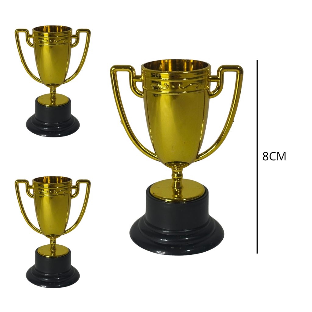 12 Mini Troféus Perfeitos para Festa e Decoração - Brilhe com Elegância! Características: - 10 mini troféus de alta qualidade - Material: Plástico - Tamanho: 7 - 8 cm - Design elegante e detalhado - Base plana para estabilidade Perfeitos para: - Festas de aniversário - Casamentos - Formaturas - Premiações - Decoração de mesa - Enfeite de ambientes Compre Agora e Adicione um Toque de Glamour às suas Festas!