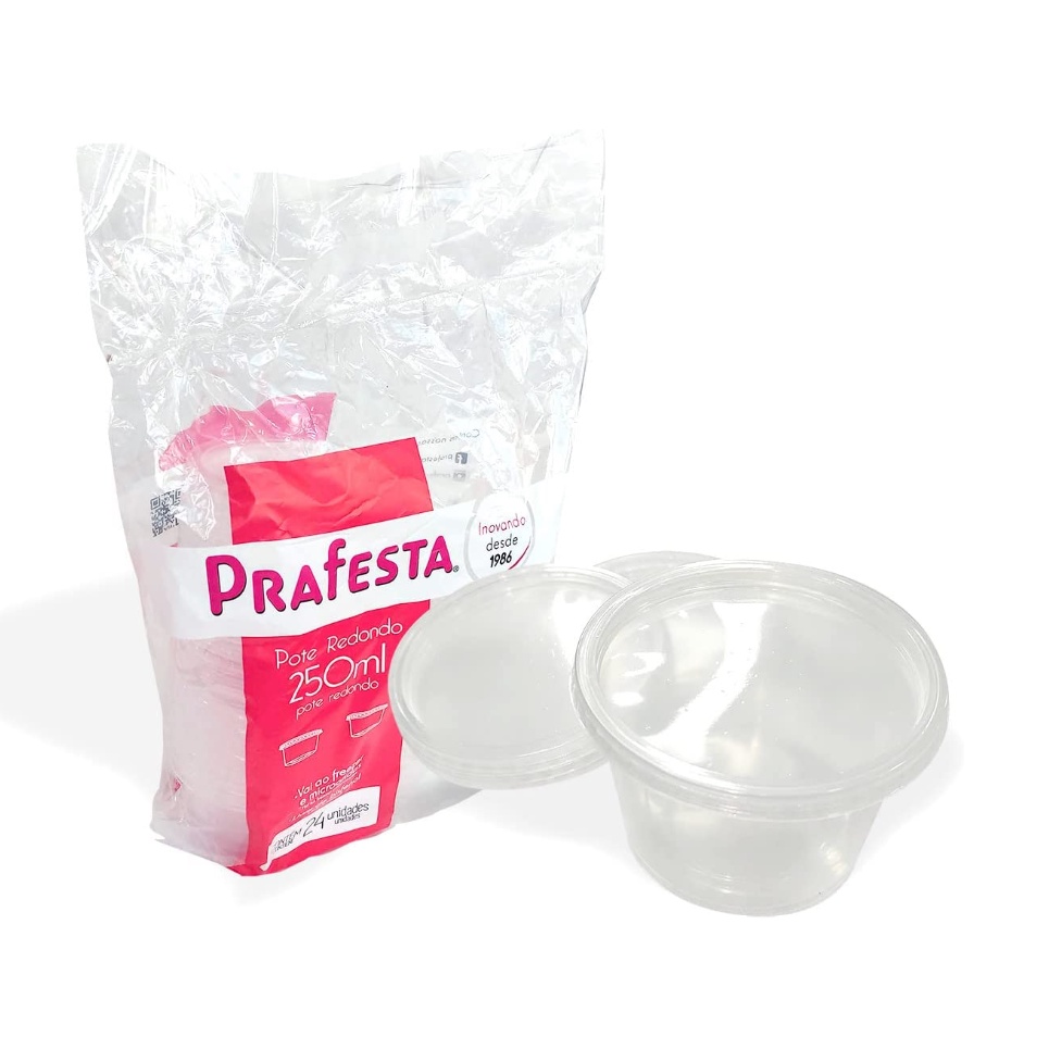 Pote redondo descartável com tampa 250ml vai no microondas e ao freezer Os Potes redondo com Tampa da Prafesta são perfeitos para armazenar diversos tipos de alimentos, em especial as guardar alimentos e vários tipos de doces. Os potes possuem uma tampa não fixa com uma excelente vedação, além de serem resistentes, podendo levado ao freezer e ao microondas sem problemas. Os potes redondo Prafesta são a maneira mais econômica, profissional e higiênica de oferecer e servir os seus doces, tortas, marmitas, saladas entre tantos outros alimentos para seus os seus clientes. 250ml de capacidade Pode ser refrigerado Pode ser levado ao microondas Temperatura máxima de uso em micro-ondas: 90ºC Pode congelar diversas vezes se preferir Possui tampa removível Ideal para armazenar e congelar marmitas Ideal para docinhos ou bolo Ideal para lembrancinha Produto não tóxico, livre de bisfenol Aqueça sempre sem tampa Pode aquecer em banho maria ou no microondas Produto pode ser reutilizado Tem capacidade de 250ml de líquido Contém 24 potes e 24 tampas Pode ser usado para qualquer tipo de alimento Os Potes são BPA free CARACTERÍSTICAS DO PRODUTO: - Marca: Prafesta - Modelo: Redondo com Tampa - Capacidade: 250ml - Tipo: Embalagem Descartável - Cor: Transparente - Material: Polipropileno (reciclável) - Produto Livre de BPA (Bisfenol-A) - Medidas: Diametro 10,55cm Altura5,95cm