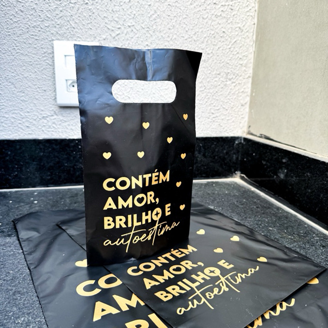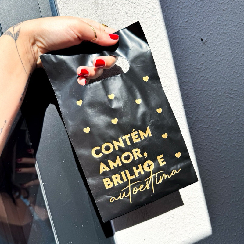 25/50 Sacola Plastica Boca de Palhaço | Preta | Contém amor, brilho e autoestima | Joias | Acessórios