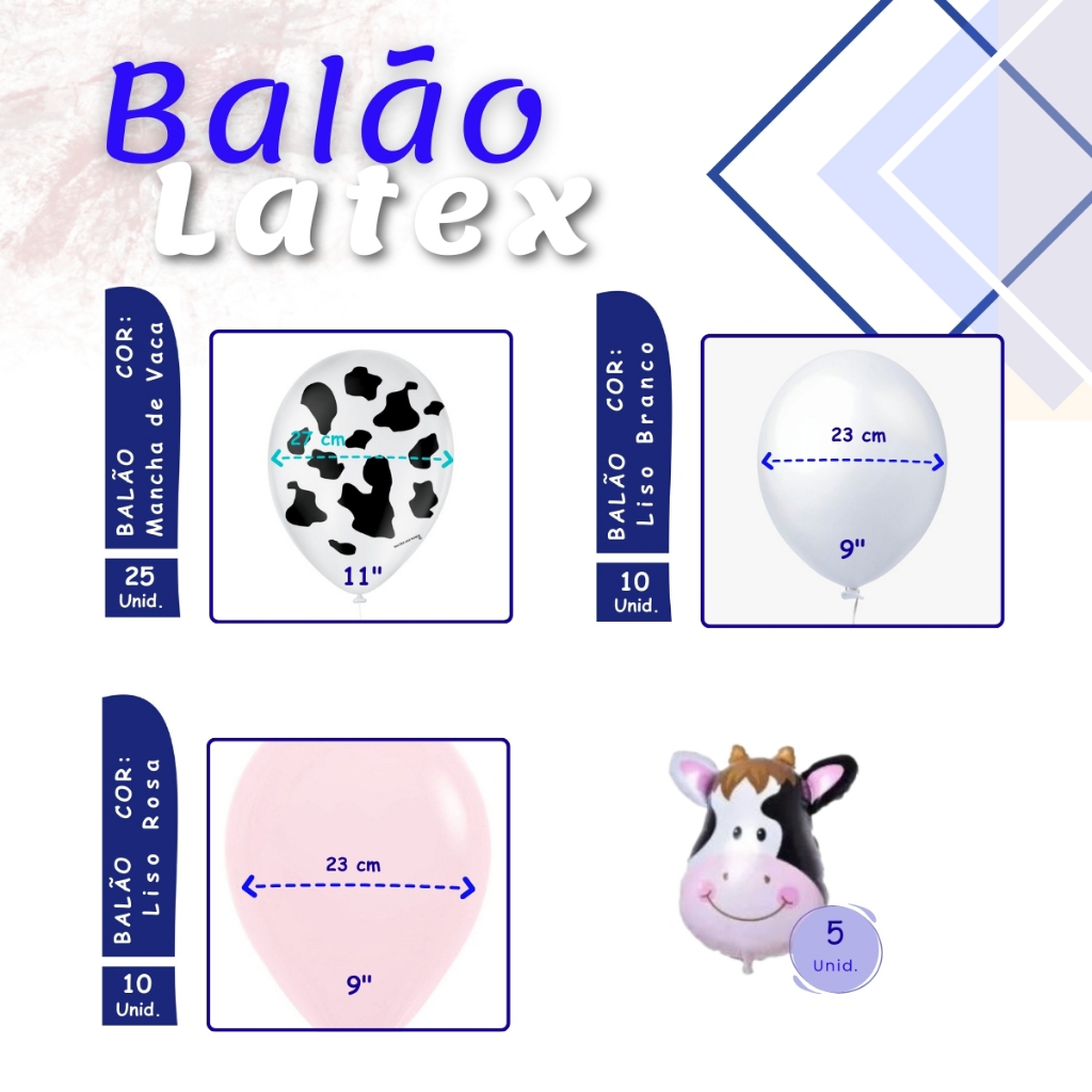25 Balões Mancha de Vaca +10 Balões Liso Rosa+ 10 Balões Branco+ 5 Balões Metalizados Aniversario