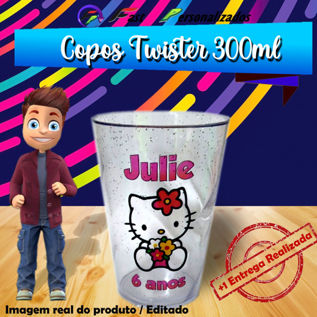 Copo Twister 300ml (sem tampas, conforme anúncio) - Personalização apenas na frente - Arte colorida - Temos os copos twister de 300ml disponível nas cores branca, transparente e transparente com glitter. Após a efetivação dos pedidos, enviaremos a montagem da arte. Agora na Fast Personalizados, você contará com envios diários. Não nos responsabilizamos por possíveis quebras no transporte, e também por atrasos nos correios. Obs. No copo branco, o "efeito twister" é visto somente na parte de dentro. Características: Medida: 300ml Altura: 11cm Boca: 7,5cm Personalização: Personalização feita por transfer sobre os copos Material: PS Cristal Virgem / Poliestireno