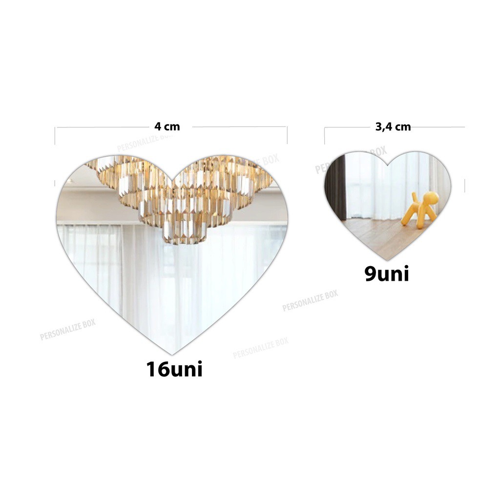 Kit com 25 mini espelhos de coração (mini corações) decorativos mais leves do que espelhos comuns para decorar seu Quarto, Sala, Hall, Escritório, Banheiro ou qualquer local desejado! CARACTERÍSTICAS: - Espessura: 2 mm ACOMPANHA: 16 x Corações de 4 x 3,5 cm 09 x Corações de 3,5 x 3 cm MATERIAL: - Acrílico espelhado. MUITO mais leve do que o vidro, por isso são indicados para o uso onde se preza pela segurança. ONDE APLICAR: - Casa: Parede de quarto, sala, varanda, etc... - Móveis em geral - Lojas: Vitrine - Escritório - Escola - Creche CUIDADOS: - Nossos espelhos decorativos podem ser aplicados em qualquer superfície LISA, ideais para aplicação em paredes PLANAS, vidros, azulejos e onde mais sua imaginação mandar. - Utilize fitas dupla face para fixação dos espelhos. Kit já vai com as fitas. - Para limpeza utilizar flanela macia e água. - O acrílico espelho possuí uma PELÍCULA de proteção no lado espelhado. - Essa PELÍCULA a primeira vista pode causar a impressão de "riscado" ou "embaçado" as peças, mas é só removê-la após a instalação.