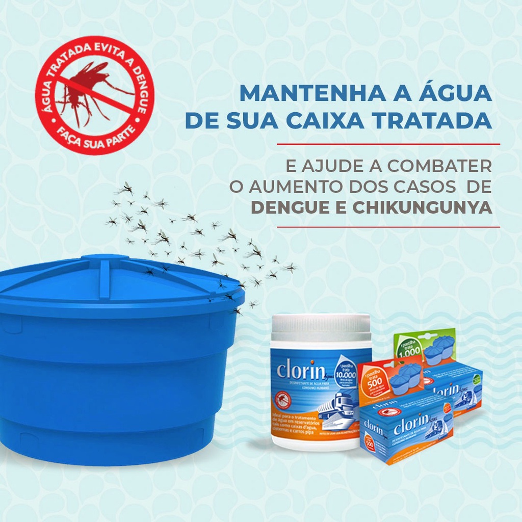 CLORIN 1.000 PASTILHAS PRÉ-DOSADAS PARA TRATAMENTO DE ÁGUA PARA CONSUMO HUMANO DIRETAMENTE NOS RESERVATÓRIOS 1 PASTILHA – 1.000 LITROS DE ÁGUA – SEGURANÇA TOTAL NA QUALIDADE DA ÁGUA - CAIXA COM 25 PASTILHAS Clorin 1.000 é indicado para tratar a água diretamente em caixas d’água ou qualquer outro reservatório destinado à sua estocagem, de forma eficaz, segura e econômica, em residências, empresas, etc. garantindo a qualidade da água. O uso regular garante a saúde, eliminando o risco de se contrair as doenças transmitidas pelas bactérias testadas presentes na água. - Eficácia comprovada no controle da Dengue, Zika e Chikungunya – repele o mosquito transmissor, impedindo a postura de ovos na água; - Trata a água de qualquer fonte ou origem; - Dispensa medição: pastilhas pré-dosadas para proporcionar dosagens exatas de cloro; - Baixo custo por litro de água tratada; - Fácil de usar, transportar e armazenar; - Pode também ser usado para a higienização dos reservatórios; - Não altera o sabor, odor ou cor da água a ser consumida. Conheça também as outras versões pré-dosadas, para frações de 500 e 10.000 litros. Modo de Usar: - Identifique a capacidade de armazenamento de sua caixa d’água ou reservatório e escolha a versão de Clorin com a dosagem ideal (1 pastilha de Clorin 500 para cada fração de 500 litros de água OU 1 pastilha de Clorin 1.000 para cada fração de 1.000 litros de água OU 1 pastilha de Clorin 10.000 para cada fração de 10.000 litros de água); - Adicione a(s) pastilha(s) na água aguarde 30 minutos antes de bebê-la ou consumi-la para quaisquer outros fins. Reposição / Manutenção: Após a primeira aplicação, a frequência da adição de novas pastilhas deverá seguir um cálculo de acordo com o consumo da água na residência ou empresa. Para medir o consumo da sua casa, considere um gasto médio de 200 a 250 litros por pessoa/dia. Caso o nível seja completado em intervalos de tempo conhecidos, basta tratar o volume de água que entrou no reservatório, utilizando as pastilhas de CLORIN pré-dosadas sempre que o intervalo de tempo for inferior a 5 dias. Atenção Para o caso de águas paradas há mais de 5 dias, o volume do reservatório deve ser completado e tratado novamente com a adição de novas pastilhas pré-dosadas para o volume correspondente. Princípio ativo: Dicloro-S-Triazinetrione de Sódio. Teor de Cloro Ativo: 50% p/p. Pastilhas de 2g de peso. Validade: 2 anos a partir da data de fabricação. Registro M.S.: 3.1243.0001