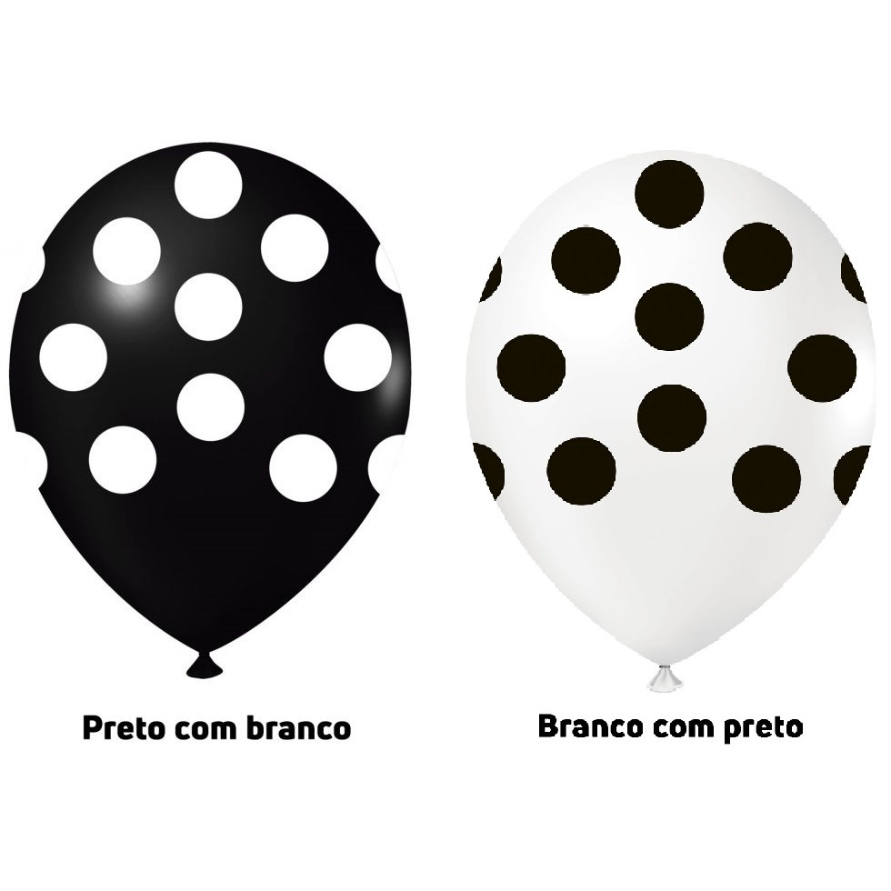 Balão de Ar - PRETO COM BOLINHAS BRANCAS OU BRANCO COM BOLINHAS PRETAS (POA) marca : Balões Joy quantidade : 25 unidades Usado para decorar festas ,confecção de arcos e esculturas em balão e também para montar telas de bexigas Formato: Arredondado Tamanho Nº: 9 polegadas Modelo: estampado composição : látex e corante