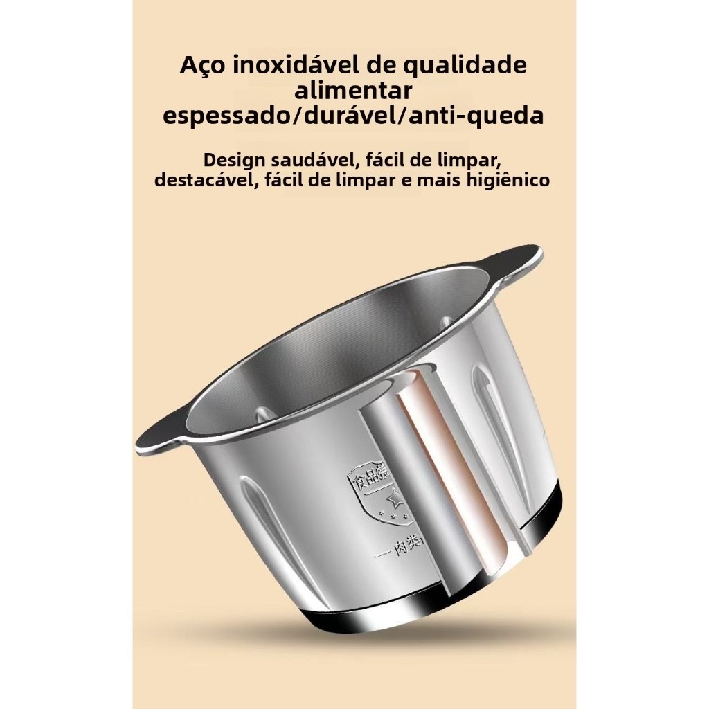Principais Caracteristicas Compacto em aço inoxidável, aparência agradável, fácil de lavar e operar.*Tem metal ao sistema de acoplamento de condução durável do metal. Possui lâmina de aço inoxidável e tapetes de borracha antiderrapantes Possui 2 velocidades, com isso pode moer e picar varios tipos de carne, legumes, frutas, grãos e temperos Especificação: Material: Aço inoxidável Capacidade: 3 Litros Potência nominal: 300w Potência máxima de pico: 300w Tensão avaliado: 110v Frequência avaliado: 50hz Velocidade: cerca de 6000 - 22000 rpm Lâmina: Aço Inoxidável quatro lâmina Velocidade: 2 Velocidades Corpo do copo: Aço inoxidável ATENÇÃO: É normal ter um odor na primeira vez que você o usa. Desaparece depois de dois ou três moinhos.2. se a retalhadora não funcionar, ou treme muito, ou é muito barulhento durante o trabalho, isso significa que há muita alimentação, ou a tigela da retalhadora, as lâminas ou o motor não se encaixam corretamente. Certifique-se de que a máquina está instalada corretamente e não encha a retalhadora de papel com mais de 1 kg de carne.3. Se as facas ficarem presas, prenda a comida na tigela e remova. Corte os alimentos em pedaços menores, coloque-os na tigela de trituração e repita o processo.4. A Máquina pode trabalhar somente quando a base do motor instalada corretamente e firmemente na cobertura da bacia!