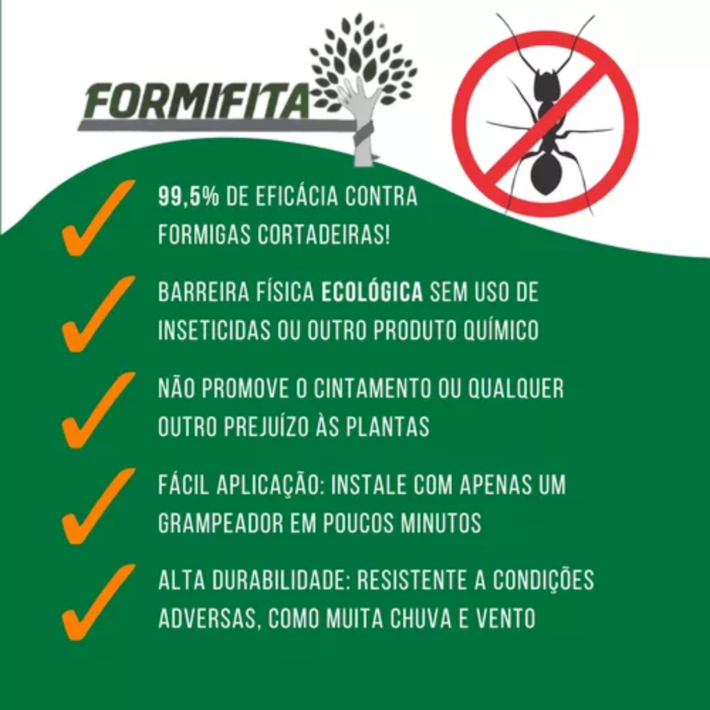 FORMIFITA - BARREIRA ECOLÓGICA CONTRA FORMIGAS CORTADEIRAS ** CADA UNIDADE CORRESPONDE A 2 METROS DE FITA ** SIGA AS INSTRUÇÕES DE USO CORRETAMENTE PARA UM BOM FUNCIONAMENTO DO PRODUTO - Formifita é uma barreira física contra a formiga cortadeira de alta durabilidade. - Não promove o cintamento ou qualquer outro prejuízo as plantas. - É fácil de aplicar, utilizando apenas um grampeador e uma tesoura. - SEM veneno, barra as formigas cortadeiras, mesmo as saúvas, com eficácia de 99,5%. Instruções de aplicação da Formifita: 1. Com a Formifita em mãos, faça uma volta no tronco da planta sem pressionar a espuma. Corte a Formifita deixando que se sobreponha excesso de 1cm. 2. Com o pedaço cortado, despregue a espuma da formifita que excedeu o laço (1cm), corte a parte da espuma e deixe a fita. 3. Coloque a Formifita sobre o tronco de modo que as extremidades com espuma se toquem. É importante não sobrar espaço entre as pontas da espuma. 4. Deve-se sobrepor a Formifita sem espuma sobre a outra extremidade. Feito isso grampeie no centro e nas duas pontas. 5. Quando houver tutor na planta também é preciso aplicar Formifita tomando cuidado para que as duas, da planta e do tutor, toquem uma na outra, evitando assim a formação de uma ponte para as formigas subirem. Controle as formigas de forma ecológica, eficaz e prática! Acompanha Manual de Instruções