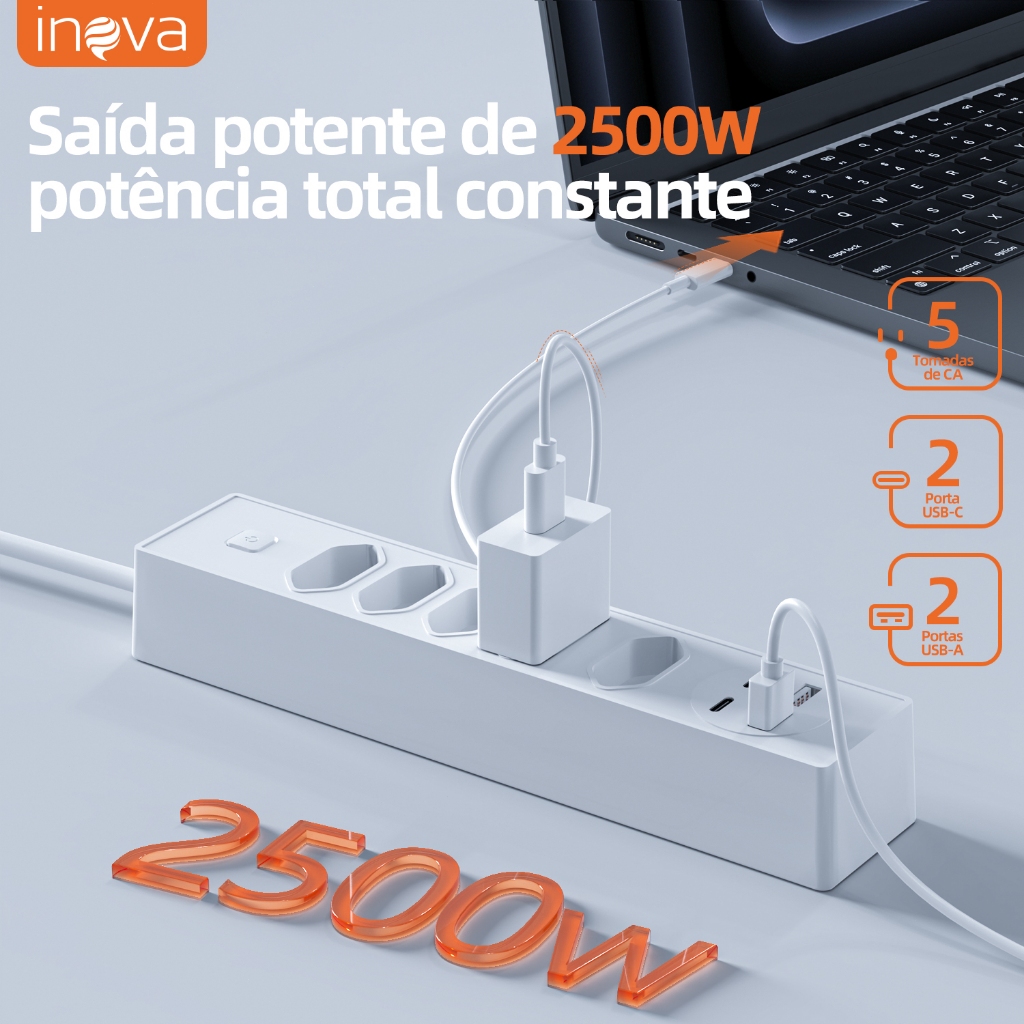 Bem-vindo ao shopping oficial basike Todos os produtos da loja são produtos bascos originais Siga esta loja e ganhe 2BRL Enviado dentro de 24 horas após o pedido ser feito Marca: inova Modelo do produto:SOC-12783 Forca máxima: 2500 w Corrente máxima: 2.4A Tensǎo nominal:100-250V Saida UsB: 5V=Q.4A(suporte para carga rápida 2A)12W 12WInterface do produto: 5 furos de soquete 2 xUSB,2 xTipo-C Comprimento da linha de produtos: 2M Principais características: 1. Botão de proteção contra sobrecarga de energia: Ao usar aparelhos elétricos superiores a 2600 W, a função de proteção da tomada será acionada e a tomada cortará automaticamente a energia. 2. 5 plugues brasileiros 3. 2 interfaces de saída USB: suporta interface de carregamento rápido 2A 4. 2 interfaces de saída tipo C: suporta interface de carregamento rápido 2A