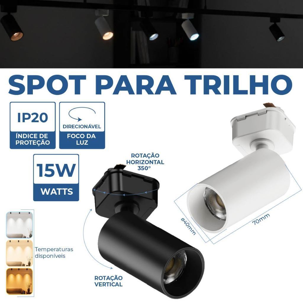 💡 Kit Trilho com Spot LED 10W / 15W / 20W / 30W Completo | Trilho 1M + Conector Tubinho | Preto ou Branco | Luz Quente, Neutra ou Fria | Bivolt Transforme seus ambientes com estilo, praticidade e iluminação profissional! O Kit Trilho com Spot LED é a solução ideal para quem busca iluminação moderna, potente e versátil. Com design sofisticado e spots direcionáveis, este conjunto é perfeito para residências, lojas, escritórios, estúdios, vitrines e restaurantes. 🌟 Destaques do Produto 💡 Disponível nas potências: 10W | 15W | 20W | 30W Escolha a potência ideal de acordo com o tamanho e a intensidade luminosa desejada. ⚙️ Trilho Eletrificado de 1 metro incluso: Instalação rápida e segura. 🔄 Spot Direcionável: Ajuste o foco de luz para destacar objetos, paredes ou áreas específicas. 🎨 Cores disponíveis: Branco ou Preto. 🌈 Temperaturas de cor disponíveis: Branco Quente (3000K): Luz aconchegante e suave. Branco Neutro (4000K): Iluminação equilibrada e confortável. Branco Frio (6500K): Luz clara e moderna. ⚡ Bivolt Automático (110V / 220V): Compatível com qualquer instalação elétrica. ⚙️ Especificações Técnicas 10W 60mm x 32mm 15W 70mm x 40mm 20W 80mm x 40mm 30W 100mm x 50mm Material: Alumínio e Plástico de alta resistência Conector: Tubinho incluso Instalação: Encaixe simples no trilho eletrificado Vida útil: +25.000 horas Fator de potência: >0,5 🏠 Ideal Para: ✅ Ambientes residenciais modernos ✅ Lojas e vitrines comerciais ✅ Restaurantes, galerias e estúdios ✅ Escritórios e espaços corporativos ✅ Decoração de interiores com foco de luz ✨ Design moderno, potência ajustável e iluminação sob medida para o seu ambiente! Com o Kit Trilho Spot LED, você tem tudo o que precisa para instalar um sistema de iluminação completo, elegante e funcional. 📦 Cores disponíveis: Preto ou Branco 💡 Temperaturas de luz: Branco Quente, Neutro ou Frio ⚡ Tensão: Bivolt Automático (110V – 220V)