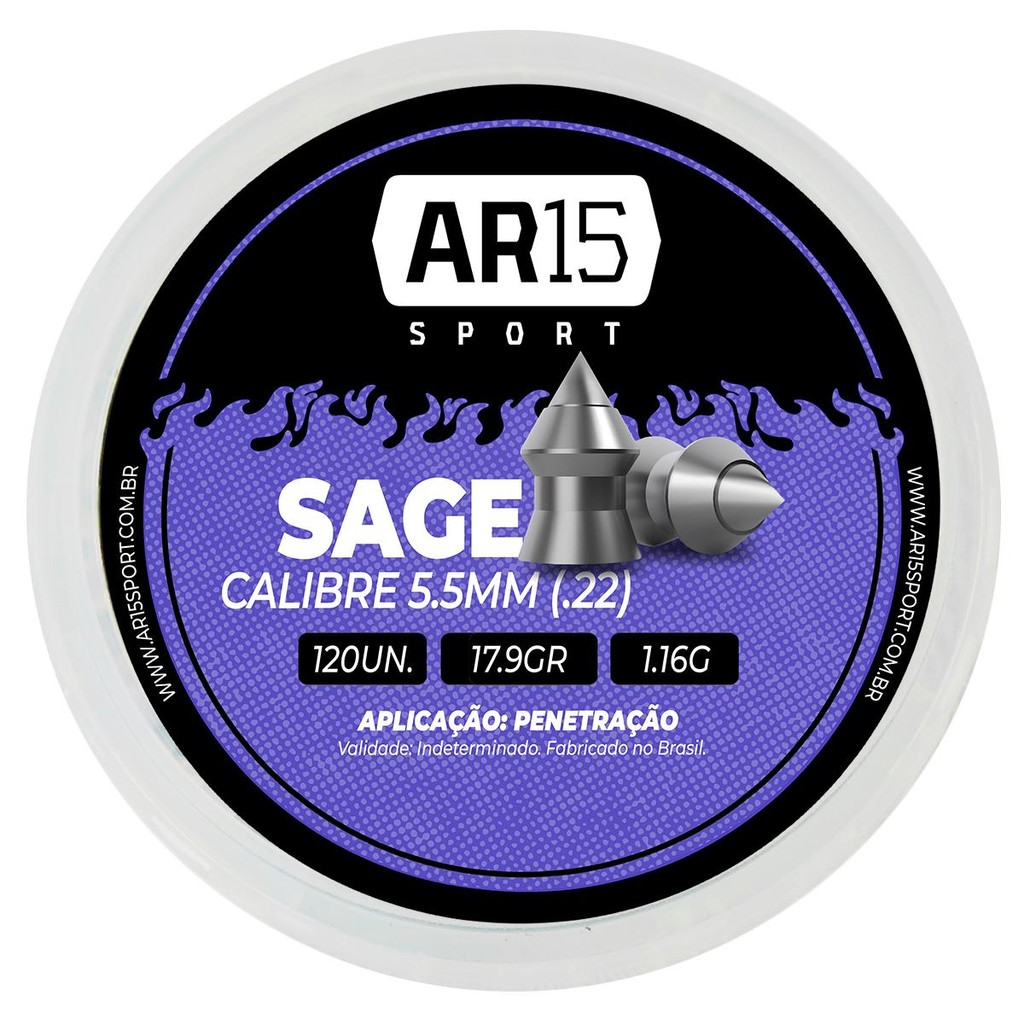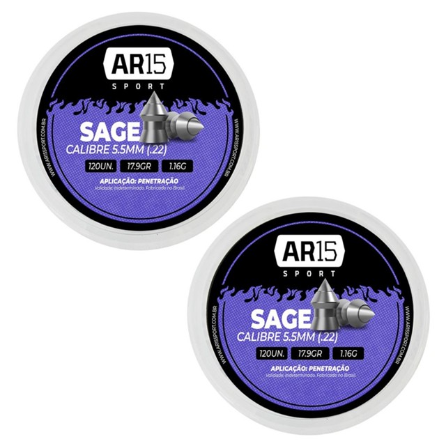 ESPECIFICAÇÕES TÉCNICAS: - Marca: Ar15 Sport - Modelo: SAGE - Calibre: 5.5mm (.22) - Quantidade: 120 unidades - Peso: 1.16 gramas - Gramatura: 17.9 grains - Material: Chumbo - Aplicação: Penetração - Comprimento: 9,0mm - Peso bruto total caixa: 156 gramas ITENS INCLUSOS: - 02 Chumbinho Ar15 Sport SAGE 5.5mm 120un. Observação: Garantia de 03 meses mediante defeitos de fábrica.