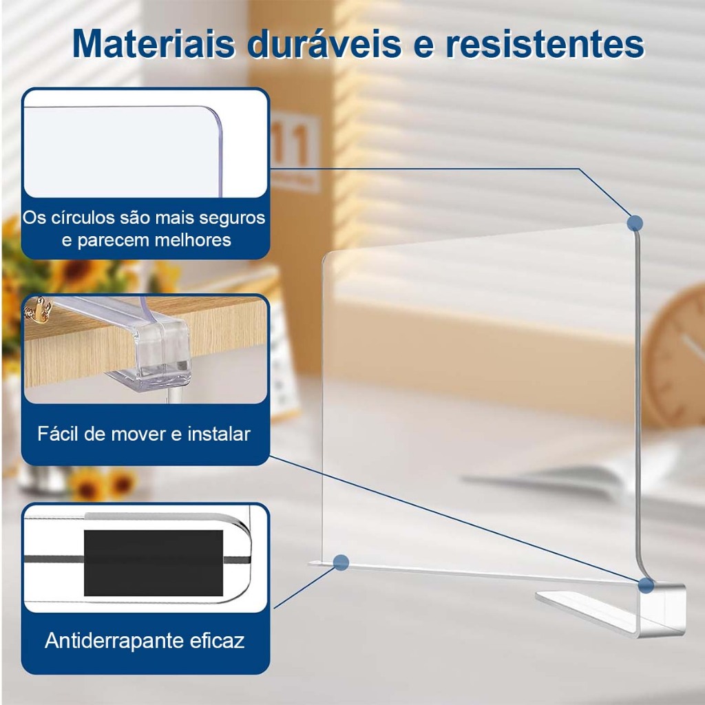 Lista de produtos: 2x Divisores de prateleiras em acrílico Mantenha seu armário organizado: Ótima maneira de separar roupas ou bolsas, nossas divisórias de prateleiras profundas podem mantê-las no lugar. Sem dúvida, isso pode liberar mais espaço para melhorar a aparência de sua casa. O problema é que não devem ser montados em uma placa com espessura superior a 0,9 polegada, pois isso fará com que se quebrem. Design inteligente: Como são maravilhosos esses divisores de prateleiras para a organização de armários, você pode personalizar o tamanho que deseja para cada “cubículo”. Ao contrário do divisor de prateleiras de arame metálico para armários, projetado com cantos arredondados e suaves, ele não arranhará suas prateleiras ou roupas. Perfeito para vários cenários: Como inserções para prateleiras, ele pode ser usado para organizar armários e ajudar a planejar o espaço na estante e na despensa. Como a posição de ajuste é mais flexível, eles podem ser usados até mesmo para organizar fotos e certificados.