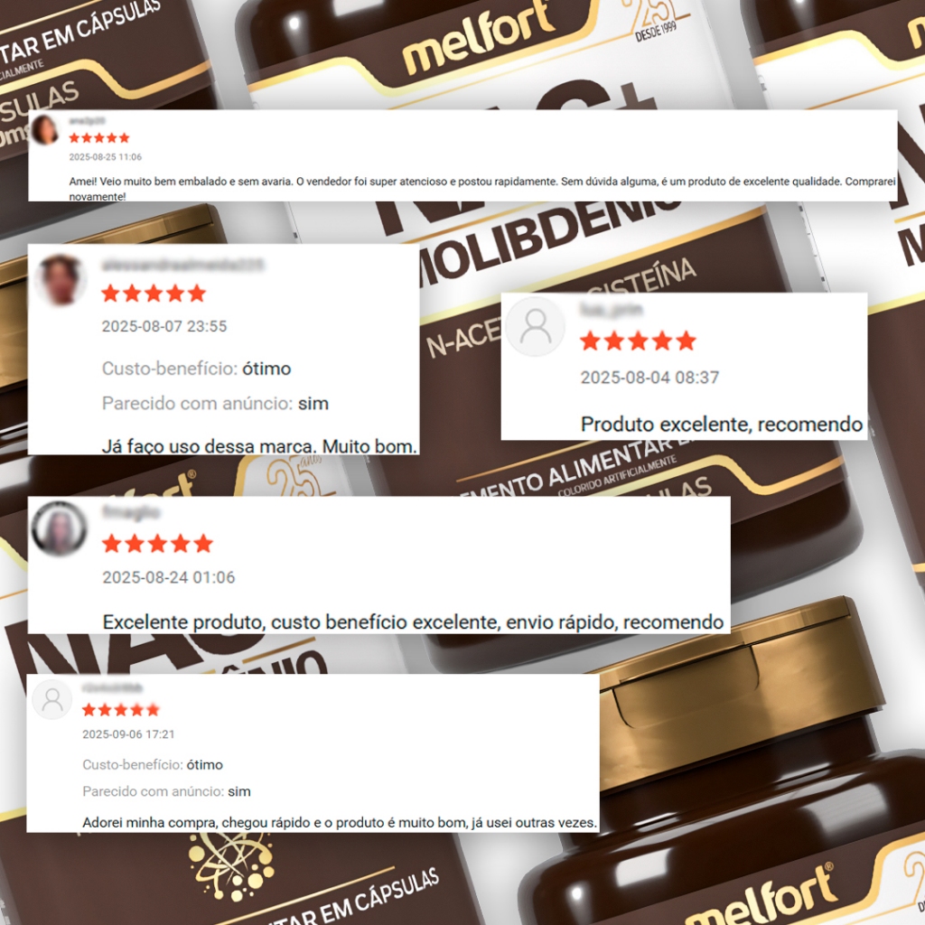 O NAC + Molibdênio é um suplemento alimentar em cápsulas desenvolvido para complementar a rotina nutricional de adultos. A formulação reúne N-Acetil L-Cisteína (NAC) e Molibdênio, com porção prática para o dia a dia. Benefícios esperados: - Apoio nutricional com NAC e molibdênio. - Porção prática de 2 cápsulas (1,0 g) ao dia. - Cápsulas de 500 mg para uso cotidiano. - Embalagem com 60 cápsulas. - Produto sem glúten. Ingredientes: N-Acetil L-Cisteína, molibdato de sódio (fonte de molibdênio), excipientes. Cápsula: gelatina e água purificada. Colorido artificialmente. Não contém glúten. Recomendações de uso: Mastigar/ingerir 2 cápsulas ao dia ou conforme orientação de médico ou nutricionista. Produto indicado para maiores de 19 anos. Conservação: Armazenar em local fresco, seco e ao abrigo da luz solar direta. Após aberto, manter a embalagem bem fechada e fora do alcance de crianças. Não consumir se o lacre estiver violado. Advertências: Este produto não é medicamento. Não exceder a recomendação diária de consumo indicada na embalagem. Em caso de dúvidas, consulte um profissional da saúde. Não deve ser consumido por gestantes, lactantes e crianças sem orientação médica.