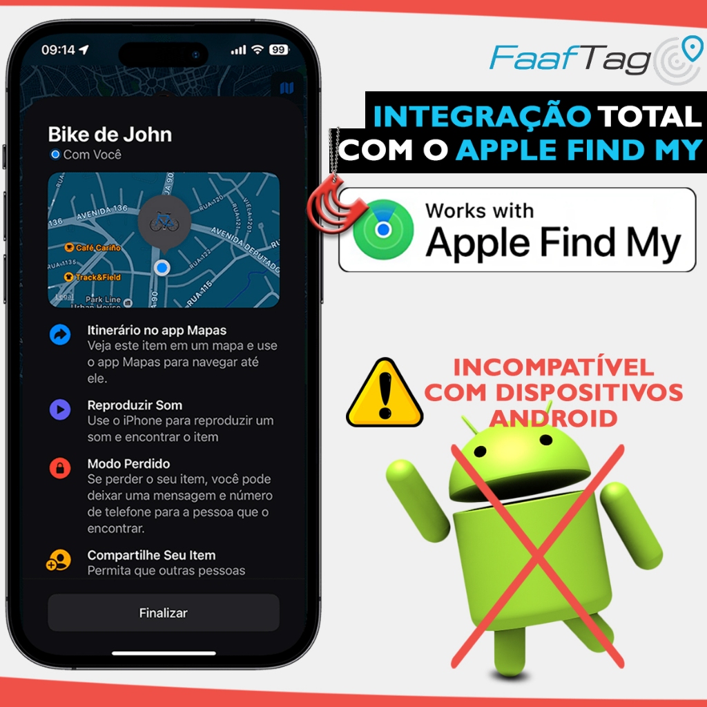 Carroussel Auto apresenta: A melhor solução de rastreamento rápida, eficiente e fácil de usar da Faaftech! ______ #USO# - Tag discreta ideal para rastrear tudo que você quiser: veículos, chaves, carteiras, bagagens, bolsas, pets, pessoas, família, amigos e muito mais - Fixação versátil pelo cordão incluso ou pelos acessórios vendidos separadamente: chaveiros e suportes ______ #TECNOLOGIA# - Integra todas funções do aplicativo Find My da Apple como: Itinerário no app Mapas, Reproduzir Som, Modo Perdido, Compartilhe Seu Item, Notificações, etc. - Alto-falante embutido para emitir um bipe ativado pelo aplicativo Find My - Compatível com iPhones com iOS 14.5 ou posterior, incluindo SE, XR, 13, 14 e 15 - NÃO é compatível com dispositivos Android ______ #ALCANCE# - Funciona em qualquer lugar do mundo - A localização da FaafTag é atualizada automaticamente quando um dispositivo Apple ligado à rede Find My estiver perto da FaafTag ______ #COMPACTO# - Diâmetro de 29mm e Altura de 9,5mm - Peso: 7 gramas ______ #BATERIA# - Acompanha bateria CR2032 com duração de até 1 ano - Bateria substituível utilizando a espátula inclusa para abrir a FaafTag ______ #ADICIONAIS# - A FaafTag NÃO é à prova d’água, mas alguns dos acessórios vendidos separadamente oferecem proteção contra água - Certificação ANATEL: 06426-24-16871 - Garantia de fábrica: 1 ano contra defeitos na fabricação ______ #CONTEÚDO DA EMBALAGEM# - 2 FaafTag FT-TAG com bateria - 2 Espátula para abrir a FaafTag e trocar a bateria - 2 Cordão para fixação - 2 Manual do usuário - 2 Certificado de Garantia ______ #OBSERVAÇÕES# - NÃO acompanha aparelho celular, imagem meramente ilustrativa - NÃO acompanha chaveiro, imagem meramente decorativa