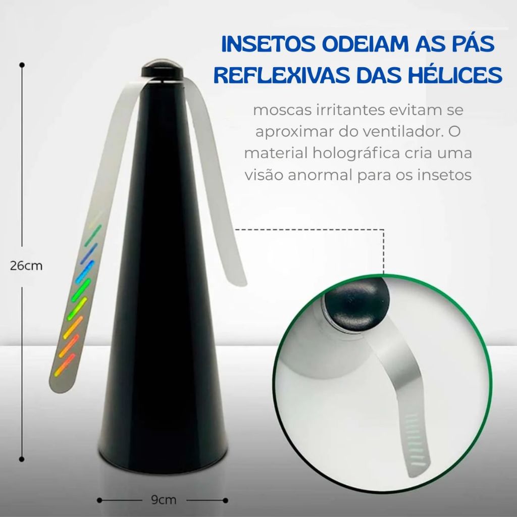 KIt 2 Repelente Ventilador Espanta Mosca Mosquito Insetos O que mantém os insetos afastados? Pontos refratam / dobram a luz que assusta os insetos. Eles sempre escolherão ir para outro lugar. mantenha A mosca longe: Você pode finalmente desfrutar de uma conversa durante uma refeição ao ar livre sem bater nas moscas o tempo todo. Este é um ventilador leve e sem odor que você coloca em cima de sua mesa de piquenique ao ar livre para impedir que as moscas bombardeiem sua comida. aprecie ao ar livre: tome banhos de sol, jogue cartas, sente-se à beira da piscina sem moscas pousando em você ou pairando sobre sua comida. Compre o Ventilador Repelente De Moscas E Insetos agora e você ficará surpreso com o quão bem ele funciona. As lâminas param se algo tocar nelas e retomam assim que o obstáculo for removido. 100% livre de produtos químicos e sem odor Produtos químicos não são seguros para uso próximo de alimentos e bebidas; Além disso, eles podem ser prejudiciais para crianças e animais de estimação. Este produto é isento de produtos químicos, portanto não atrapalha sua refeição com odores fortes nem coloca em risco a saúde de sua família. Lâminas suaves e de parada rápida Este repelente vem com lâminas macias e flexíveis que detectam sua mão se aproximando e param de girar! CARACTERÍSTICAS: MATERIAL: Plástico TIPO BATERIA: 2 Pilhas AA DIMENSÕES: 26cm (A) x 9cm (L) | Comprimento com as hélices: 39cm (L)