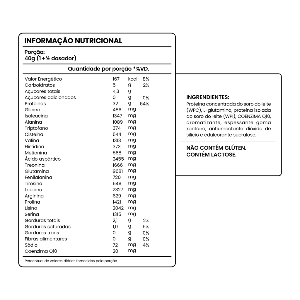 2x Whey Protein 100% 2,1kg (4,2kg) Health time + Creatina 300g + Coqueteleira 700ml *32g de Proteínas por porção *Baixo em carboidratos *Zero açúcar *Sem glúten *Coenzima Q10 *10g de EAA por porção *Absorção rápida SABORES DISPONÍVEIS (CHOCOLATE, MORANGO, BAUNILHA, CHOCOLATE BRANCO, CAPPUCCINO E BANANA COM CANELA) Ingredientes Chocolate: Proteína Concentrada do Soro do Leite (WPC), L-glutamina, Proteína Isolada do Soro do Leite (WPI), Coenzima Q10, Cacau em Pó, Espessante Goma Xantana, Antiumectante dióxido de silício e Edulcorante Sucralose. Ingredientes Morango: Proteína Concentrada do Soro do Leite (WPC), L-glutamina, Proteína Isolada do Soro do Leite (WPI), Coezima Q10, Aroma Artificial de Morango, Espessante Goma Xantana, Antiumectante dióxido de silício, Edulcorante Sucralose, Acidulante ácido cítrico, Corante Ponceau 4R. Ingredientes Baunilha: Proteína Concentrada do Soro do Leite (WPC), L-glutamina, Proteína Isolada do Soro do Leite (WPI), Coenzima Q10, Aroma Idêntico ao Natural de Baunilha, Espessante Goma Xantana, Antiumectante dióxido de silício e Edulcorante Sucralose. Ingredientes Chocolate Branco: Proteína Concentrada do Soro do Leite (WPC), L-glutamina, Proteína Isolada do Soro do Leite (WPI), Coenzima Q10, Aroma Idêntico ao Natural de Chocolate Branco, Espessante Goma Xantana, Antiumectante dióxido de silício e Edulcorante Sucralose. Ingredientes Cappuccino: Proteína Concentrada do Soro do Leite (WPC), L-glutamina, Proteína Isolada do Soro do Leite (WPI), Coenzima Q10, Cacau em Pó, Café, Canela em Pó, Espessante Goma Xantana, Antiumectante dióxido de silício e Edulcorante Sucralose. Ingredientes Banana com Canela: Proteína Concentrada do Soro do Leite (WPC), L-glutamina, Proteína Isolada do Soro do Leite (WPI), Coenzima Q10, Aroma Idêntico ao Natural de Banana, Canela em Pó, Espessante Goma Xantana, Antiumectante dióxido de silício e Edulcorante Sucralose. Whey Health Time 100%: Potencialize Seus Resultados com a Melhor Proteína do Mercado! A Whey Health Time 100% é a escolha ideal para quem busca uma alimentação completa e saudável, com benefícios comprovados para o seu corpo e desempenho. Com uma fórmula rica em proteínas do soro do leite, ela oferece uma série de vantagens que vão além da simples nutrição. Benefícios para o Sistema Imunológico: • Fortalece a imunidade e auxilia na produção de anticorpos. • Equilibra a flora intestinal e ajuda na prevenção de problemas digestivos, como constipação e diarreia. Recuperação Muscular e Desempenho Físico: • Potencializa a recuperação muscular e melhora o desempenho físico. • Ideal para quem busca acelerar a regeneração após treinos intensos e otimizar a construção muscular. Aminoácidos Essenciais (EAA) para Resultados Rápidos: • A Whey Health Time 100% é enriquecida com EAA, que são fundamentais para o crescimento muscular e recuperação. • Eles aumentam a síntese proteica, ajudam na prevenção de lesões e garantem maior energia e resistência durante os treinos. Coenzima Q10 para Mais Energia e Proteção: • Com ação antioxidante, a coenzima Q10 fortalece o sistema imunológico, melhora a recuperação muscular e favorece a circulação sanguínea. • Ela também protege as células contra os danos dos radicais livres, promovendo uma saúde geral melhor. Glutamina para Melhor Imunidade e Recuperação: • A glutamina presente na Whey Health Time 100% melhora a saúde intestinal, acelera a recuperação muscular e fortalece o sistema imunológico. • Além disso, ela contribui para uma cicatrização mais rápida de feridas e melhora a absorção de nutrientes. MODO DE PREPARO: Para o preparo de uma porção, misture 40g (1 dosador e meio) do produto em 150mL (1 copo) de sua bebida preferida (água gelada, leite desnatado, etc). SUGESTÃO DE USO: Utilize de uma a duas porções ao dia, ou conforme orientação de nutricionista ou médico. Produto indicado para grupo populacional 19 anos. Contém LACTOSE. ALÉRGICOS: Contém derivados de leite. Pode conter derivados de ovo e soja. ADVERTÊNCIAS: ESTE PRODUTO NO SUBSTITUI UMA ALIMENTAÇÃO EQUILIBRADA E SEU CONSUMO DEVE SER ORIENTADO POR NUTRICIONISTA OU MÉDICO. CREATINA 300g MODO DE PREPARO/SUGESTÃO DE USO A diluição recomendada é de 3g (2 dosadores) do produto em água ou sua bebida preferida até completa homogeneização. Produto indicado para grupo populacional 19 anos. LACTOSE Não contém. ALÉRGICOS Pode conter derivados de leite, ovo e soja. VALIDADE: 24meses. ADVERTÊNCIAS ESTE PRODUTO NÃO SUBSTITUI UMA ALIMENTAÇÃO EQUILIBRADA E SEU CONSUMO DEVE SER ORIENTADO POR NUTRICIONISTA OU MÉDICO. O CONSUMO DE CREATINA ACIMA DE 3g AO DIA PODE SER PREJUDICIAL À SAÚDE. ESTE PRODUTO NÃO DEVE SER CONSUMIDO POR CRIANÇAS, GESTANTES, IDOSOS E PORTADORES DE ENFERMIDADES. CONTEÚDO LÍQUIDO 300g
