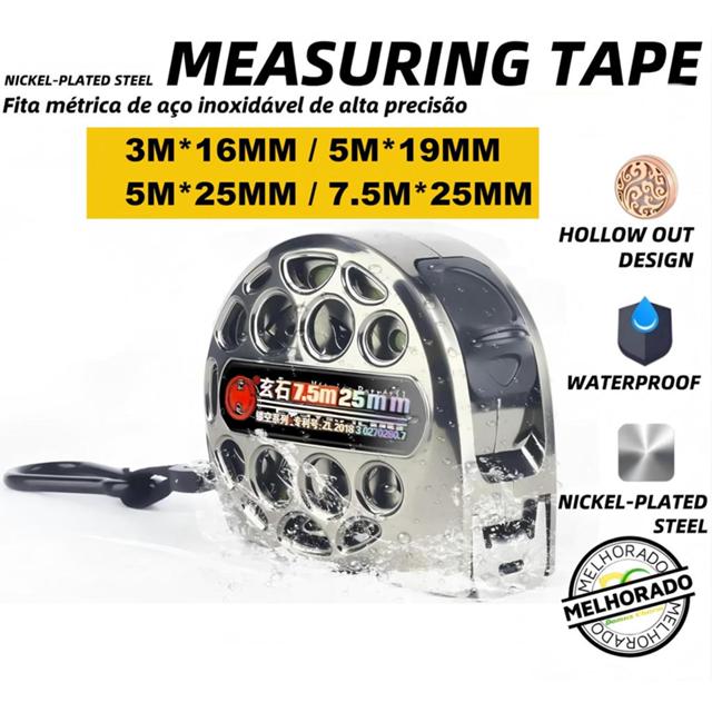 - **Material**: Aço Inoxidável Niquelado - **Comprimentos Disponíveis**: 3M, 5M, 7,5M - **Unidade de Medição**: Milímetros (mm) - **Peso**: Leve e fácil de carregar Ideal para medir áreas de construção, peças de móveis ou qualquer outro projeto doméstico ou profissional. Guarde em local seco para garantir maior durabilidade.