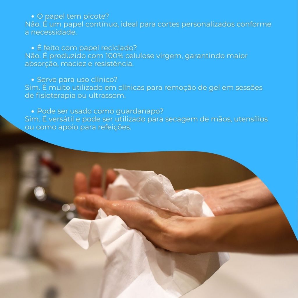 3-6 Toalha de Papel em Rolo Branco 500g 100% Celulose – Lisa, Sem Picote, para Lavabo, Banheiro e Uso Profissional A Toalha de Papel em Rolo Lisa, fabricada com 100% celulose virgem, é ideal para ambientes que exigem higiene, praticidade e versatilidade. Por ser contínua (sem picote), permite o corte na medida ideal para cada tipo de uso, otimizando o consumo. Indicada para secagem das mãos, limpeza de bancadas, remoção de resíduos em clínicas ou até mesmo como guardanapo, essa toalha é amplamente utilizada em banheiros, vestiários, clínicas, lanchonetes, indústrias e residências. Este anúncio refere-se a um kit com 3 a 6 rolos, cada um com 500g de papel branco contínuo. FICHA TÉCNICA Produto: Toalha de papel em rolo lisa (sem picote) Material: 100% celulose virgem Cores: Branco Quantidade: 3 a 6 rolos (conforme escolha) Peso por rolo: 500g Indicação: Secagem de mãos, limpeza de superfícies, remoção de gel, secagem de utensílios e uso geral DIMENSÕES Largura do papel: 20 cm Comprimento: Indefinido (conforme gramatura e uso) Gramatura: 22 g/m² Formato: Rolo contínuo (sem picote) FAQ – PERGUNTAS FREQUENTES O papel tem picote? Não. É um papel contínuo, ideal para cortes personalizados conforme a necessidade. É feito com papel reciclado? Não. É produzido com 100% celulose virgem, garantindo maior absorção, maciez e resistência. Serve para uso clínico? Sim. É muito utilizado em clínicas para remoção de gel em sessões de fisioterapia ou ultrassom. Pode ser usado como guardanapo? Sim. É versátil e pode ser utilizado para secagem de mãos, utensílios ou como apoio para refeições. Qual o conteúdo da embalagem? A embalagem contém de 3 a 6 rolos com 500g cada, conforme escolha do comprador.