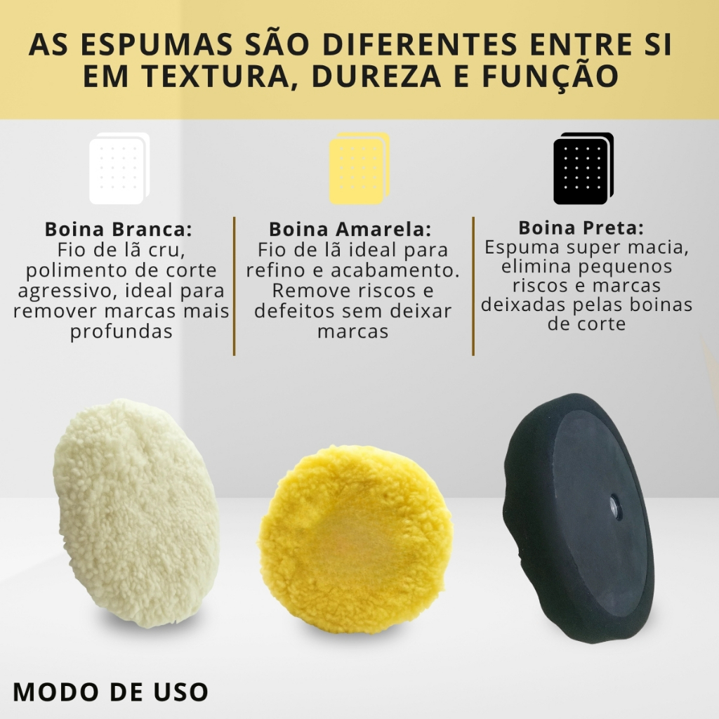 | 3 Boinas de lã e espuma para polimento 7 Polegadas rosca f u corte... este produto | R$ 130,50 | 10% | 5.0/5 | — |