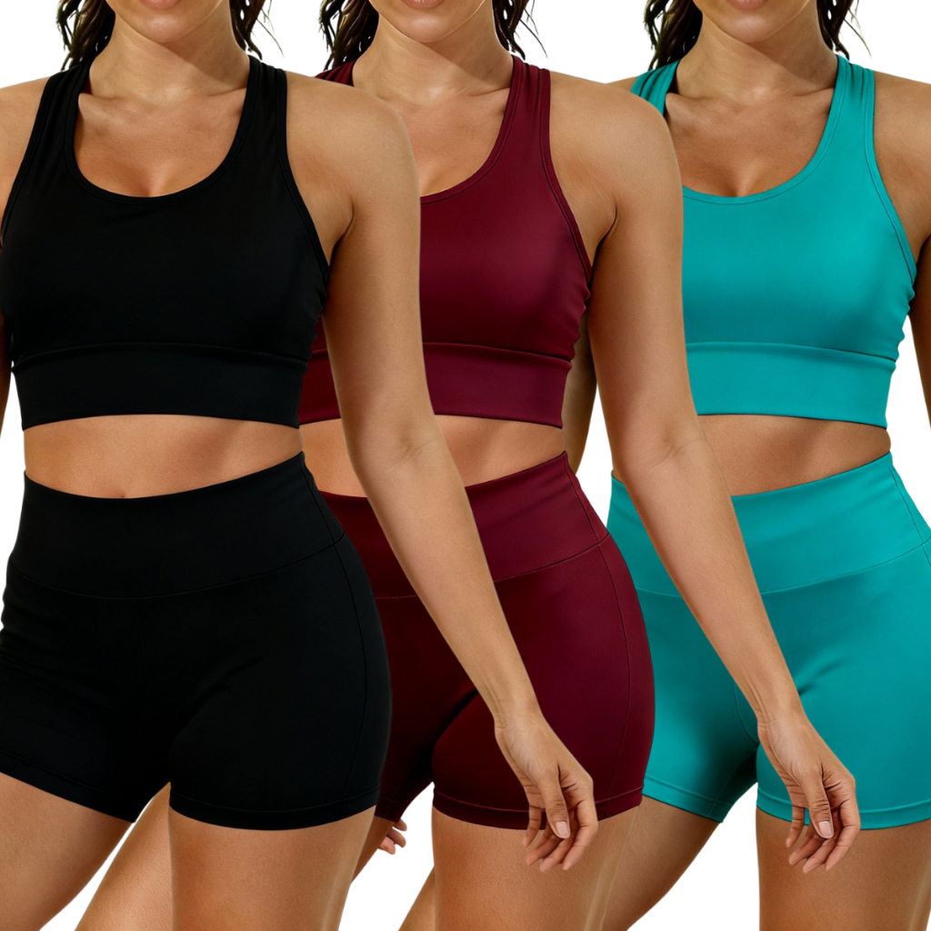 Kit com 3 Conjuntos Fitness Femininos – Top e Short em Suplex Liso | Cintura Alta e Conforto Extremo Mais praticidade e estilo para o seu dia a dia! Esse kit vem com 3 conjuntos fitness completos (top + short), perfeitos para quem ama se exercitar com liberdade, conforto e um visual moderno. Feitos em tecido suplex premium, os conjuntos possuem toque macio, excelente elasticidade e um caimento que realça o corpo sem marcar. A cintura alta ajuda a modelar a silhueta e o top, sem bojo, garante conforto durante todo o treino. ✅ Benefícios do Kit: • Você recebe 3 conjuntos completos (top + short) • Tecido firme, macio e com ótimo ajuste ao corpo • Não fica transparente e não enrola na cintura • Cintura alta que modela e valoriza o corpo • Sem bojo e sem entrada para bojo • Seca rápido, não precisa passar e não forma bolinhas • Não desbota nem desfia, mesmo após várias lavagens • Ideal para academia, corrida, treino, pilates ou lazer 📌 Cores disponíveis: Preto, Vinho, Rosa, Verde Água e Verde Esmeralda (As cores reais podem apresentar leve variação conforme iluminação ou tela.) 📌 Composição do tecido: 88% Poliéster | 12% Elastano ⚠️ Atenção: Após selecionar a variação desejada, não é possível alterar cor ou tamanho. Confira a tabela de medidas antes de concluir sua compra. 📏 Tabela de Medidas (podem variar até 2 cm) P (veste 34/36) Short: Cintura 30 cm | Comprimento 34 cm Top: Busto 34 cm | Comprimento 30 cm M (veste 38/40) Short: Cintura 32 cm | Comprimento 36 cm Top: Busto 36 cm | Comprimento 32 cm G (veste 42/44) Short: Cintura 33 cm | Comprimento 38 cm Top: Busto 39 cm | Comprimento 33 cm GG (veste 44/46) Short: Cintura 35 cm | Comprimento 40 cm Top: Busto 40 cm | Comprimento 35 cm