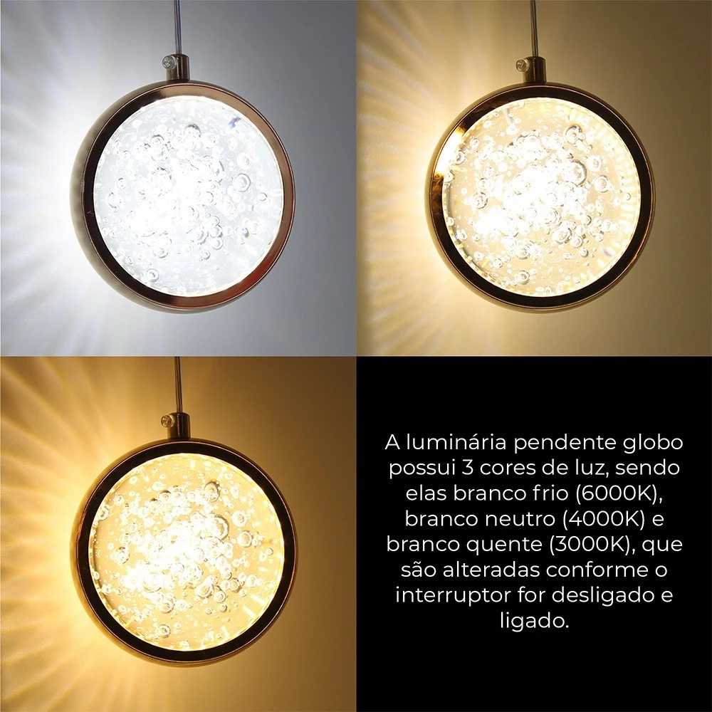 3 Cores Luminária Pendente Saturno Cristal Bolhas Redondo Gold Preto 7W Bivolt 110V-220V