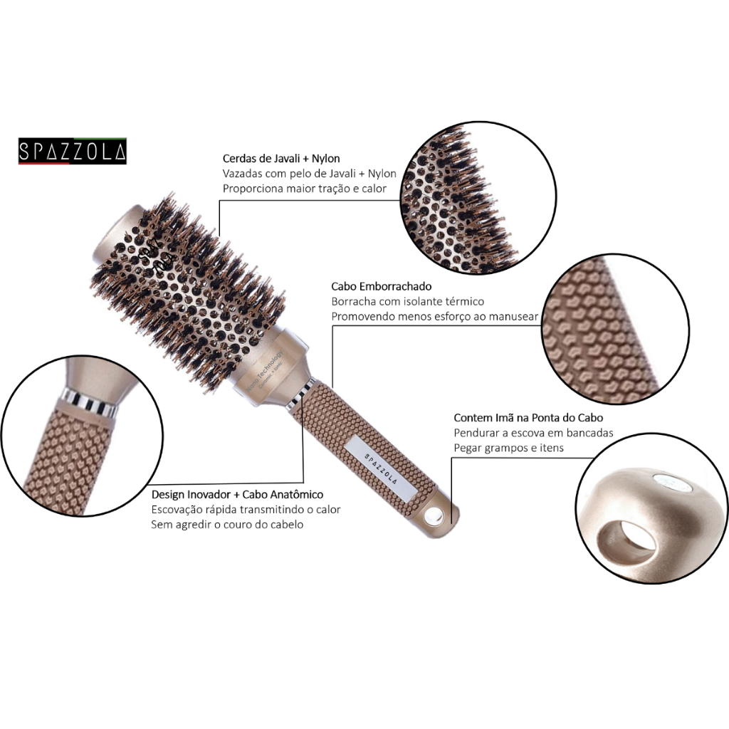 A Escova Profissional SPAZZOLA Vazada + Pelo de Javali é de origem Italiana, confeccionada com matéria prima selecionada, não agride o couro cabeludo e não quebra o cabelo, é resistente ao calor e as substâncias químicas, trazendo qualidade e durabilidade. Este tipo de escova Cerdas de javali com seu corpo Vazado foi desenvolvida em nosso laboratório para agilizar a tração na escovação trazendo o mesmo aspecto de uma escova convencional porem transmitindo o mesmo calor de uma vazada, pode ser usada com produtos químicos: progressivas, relaxamentos tinturas entre outros... São Resistentes a qualquer tipo de calor reduz a quebra, agilizando a secagem e reduzindo o frizz dos fios. As Escovas de cabelo Vazada + Pelo de Javali Spazzola possuem suas cerdas sintéticas de Nylon + pelo de javali, unindo a durabilidade do material sintético e a alta performance do pelo de javali. Cabo revestido com borracha antiderrapante que proporciona uma pegada anatômica trazendo conforto e agilidade no uso para todos os profissionais. Possui Imã na ponta para pegar grampos e pendurar em bancadas, agilizando a praticidade e rapidez. Você terá em mãos a nossa escova mais completa de primeira linha, perfeita para escovar e finalizar todos os tipos de cabelo. Você vai receber: 1- Kit com 3 escovas Vazadas SPAZZOLA Pelo de javali. Contendo: 1x Escova 25,0cmx5,0cm Peso: 41,2g 1x Escova 25,0cmx6,2cm Peso: 60,8g 1x Escova 25,0cmx7,8cm Peso: 74,1g