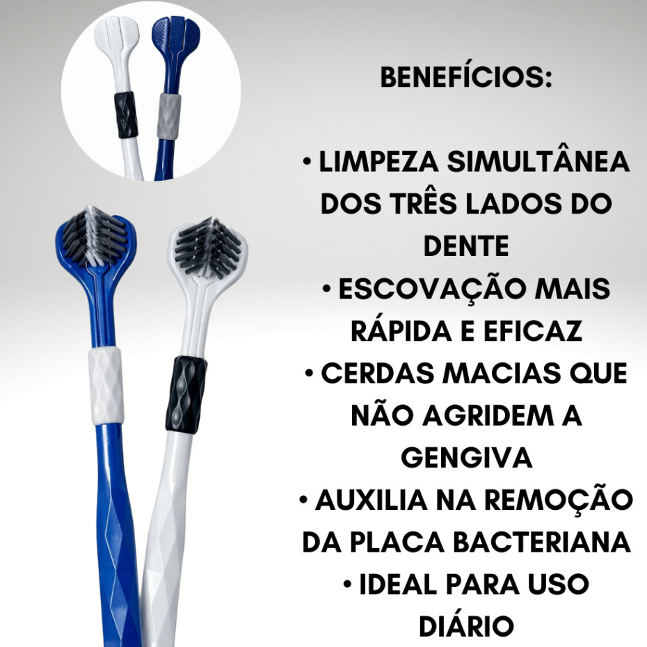 Kit com 3 Escovas de Dentes 3 Lados – Limpeza Rápida e Eficiente Torne a higiene bucal do dia a dia mais prática e eficiente! O Kit com 3 Escovas de Dentes 3 Lados foi desenvolvido para limpar todas as superfícies dos dentes ao mesmo tempo, garantindo uma limpeza completa em menos tempo. Com cerdas suaves, proporciona escovação confortável, removendo a placa sem machucar a gengiva. Perfeita para uso diário por adultos e crianças. Principais Benefícios ✔ Limpeza em 3 lados simultâneos (360°) ✔ Escovação mais rápida e eficiente ✔ Cerdas macias: conforto e proteção para a gengiva ✔ Design ergonômico e fácil de usar ✔ Ideal para uso diário Indicação Higiene bucal diária Adultos e crianças Pessoas que buscam praticidade e melhor limpeza Conteúdo da Embalagem: 3 Escovas de Dentes De 3 Lados Vantagens deste kit: Praticidade, eficiência e cuidado completo para seu sorriso todos os dias. Ideal para uso diário em casa e para toda a família. Produto pronto para envio! Garanta já o seu Kit 3 Escovas 3 Lados e facilite sua rotina de escovação.