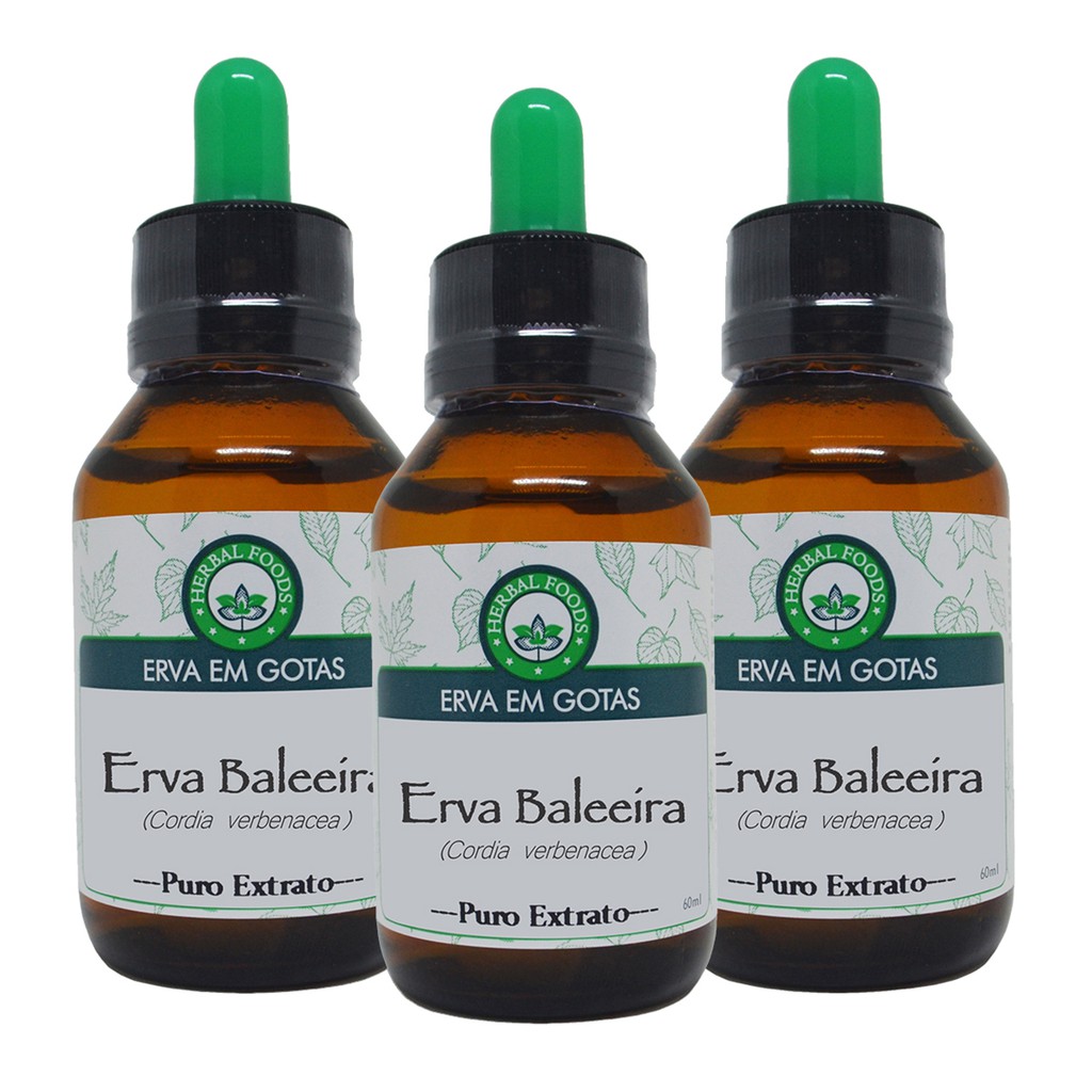 3 Extratos de Erva Baleeira 60ml - ( Tintura Mãe ) Nome Científico: Cordia verbenacea; Partes Utilizadas: Folhas; Tipo de Produto: Suplemento alimentar sem glúten ou lactose. Sugestão de uso: Tomar 30 gotas em 50ml de água, 3x ao dia (8/8horas), ou conforme orientação. Rendimento: Utilizando as dosagens recomendadas, cada frasco terá um rendimento aproximado de 20 dias. Ingredientes: Cordia verbenacea e malte de cereais.