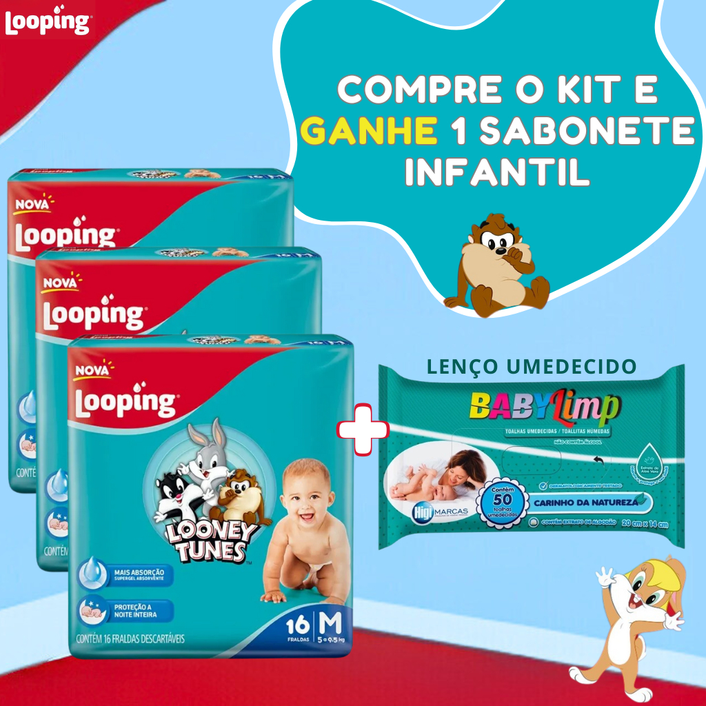 3 Pacote Fralda Descartavel Looney Tunes + Lenço Umedecido Infantil