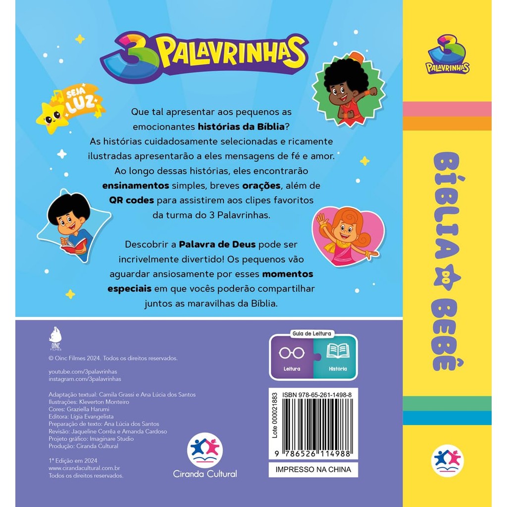 Que tal apresentar aos pequenos as emocionantes histórias da Bíblia? As histórias cuidadosamente selecionadas e ricamente ilustradas apresentarão a eles mensagens de fé e amor. Ao longo dessas histórias, eles encontrarão ensinamentos simples, breves orações, além de QR codes para assistirem aos clipes favoritos da turma do 3 Palavrinhas. Descobrir a Palavra de Deus pode ser incrivelmente divertido! Os pequenos vão aguardar ansiosamente por esses momentos especiais em que vocês poderão compartilhar juntos as maravilhas da Bíblia. 13x17cm 48 Páginas Idade Recomendada 0 a 3 anos