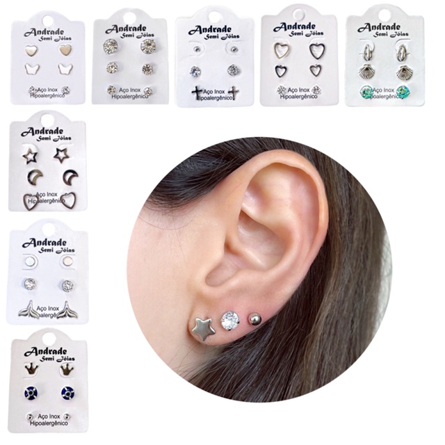 | 3 Pares Trio Brincos Pequenos Em Aço Inox Pedras Strass Vários Mode... este produto | R$ 12,99 | — | 4.9/5 | 75 |