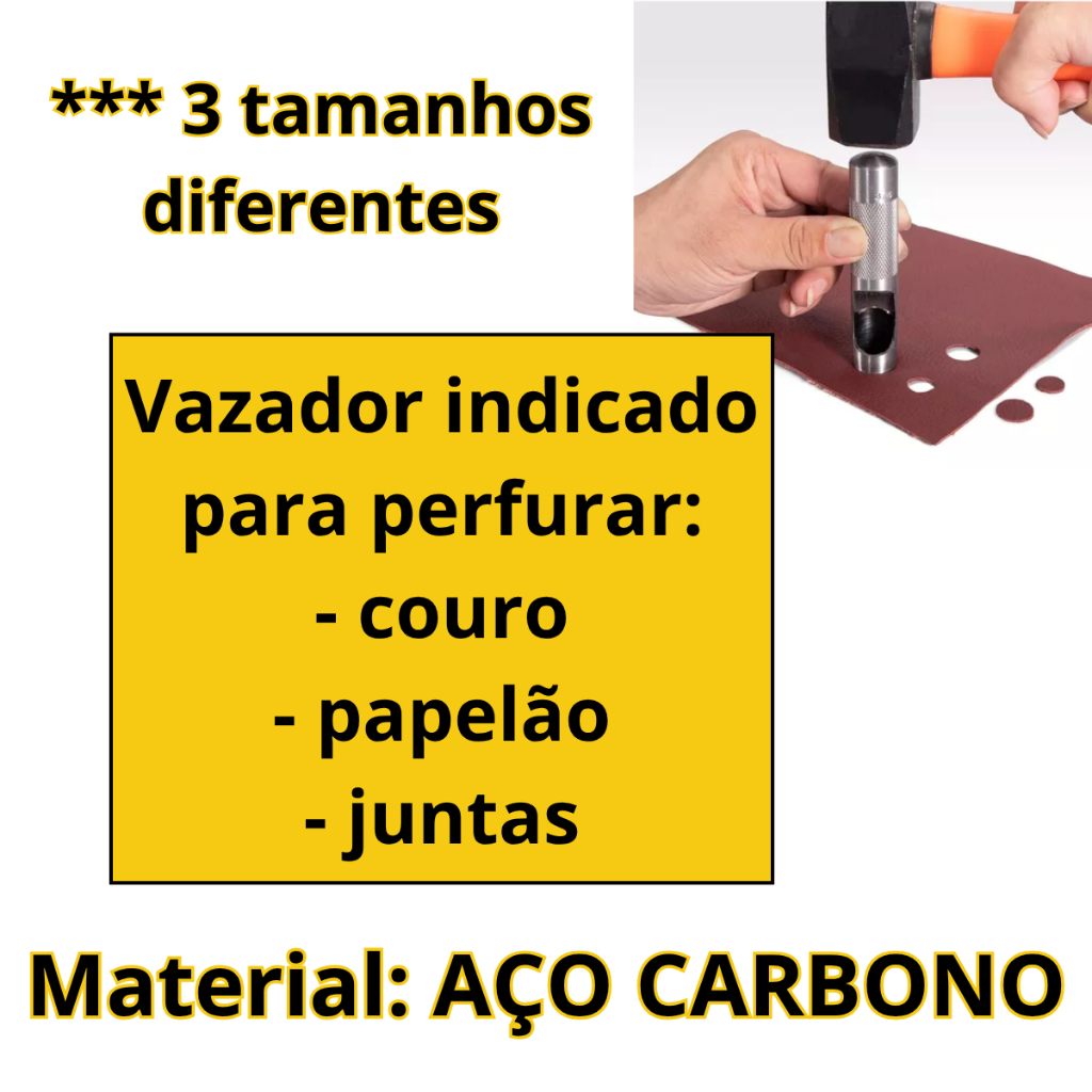 3 pcs Perfurador 14,15,16mm Couro Borracha Papelão Vazador Aço IMPORTANTE: Indicado para perfurar couro, papelão e juntas. MARCA: VONDER ITENS INCLUSOS: 1 unidade furador/vazador de aço 14mm 1 unidade furador/vazador de aço 15mm 1 unidade furador/vazador de aço 16mm MATERIAL: Aço Carbono MEDIDAS: - Diâmetro furação = 14mm - Comprimento total = 132mm - Diâmetro furação = 15mm - Comprimento total = 137mm - Diâmetro furação = 16mm - Comprimento total = 137mm - Envia ainda hoje? Sim. Comprando até às 12:00 postaremos no mesmo dia. IMPORTANTE: No ato da compra, caso necessário, enviaremos uma mensagem confirmando algumas informações, como: ano, modelo e motor, para evitar enganos no envio e transtornos posteriores, caso não haja a confirmação, enviaremos conforme o anúncio que a compra foi feita. Os envios são realizados de segunda a sexta-feira.