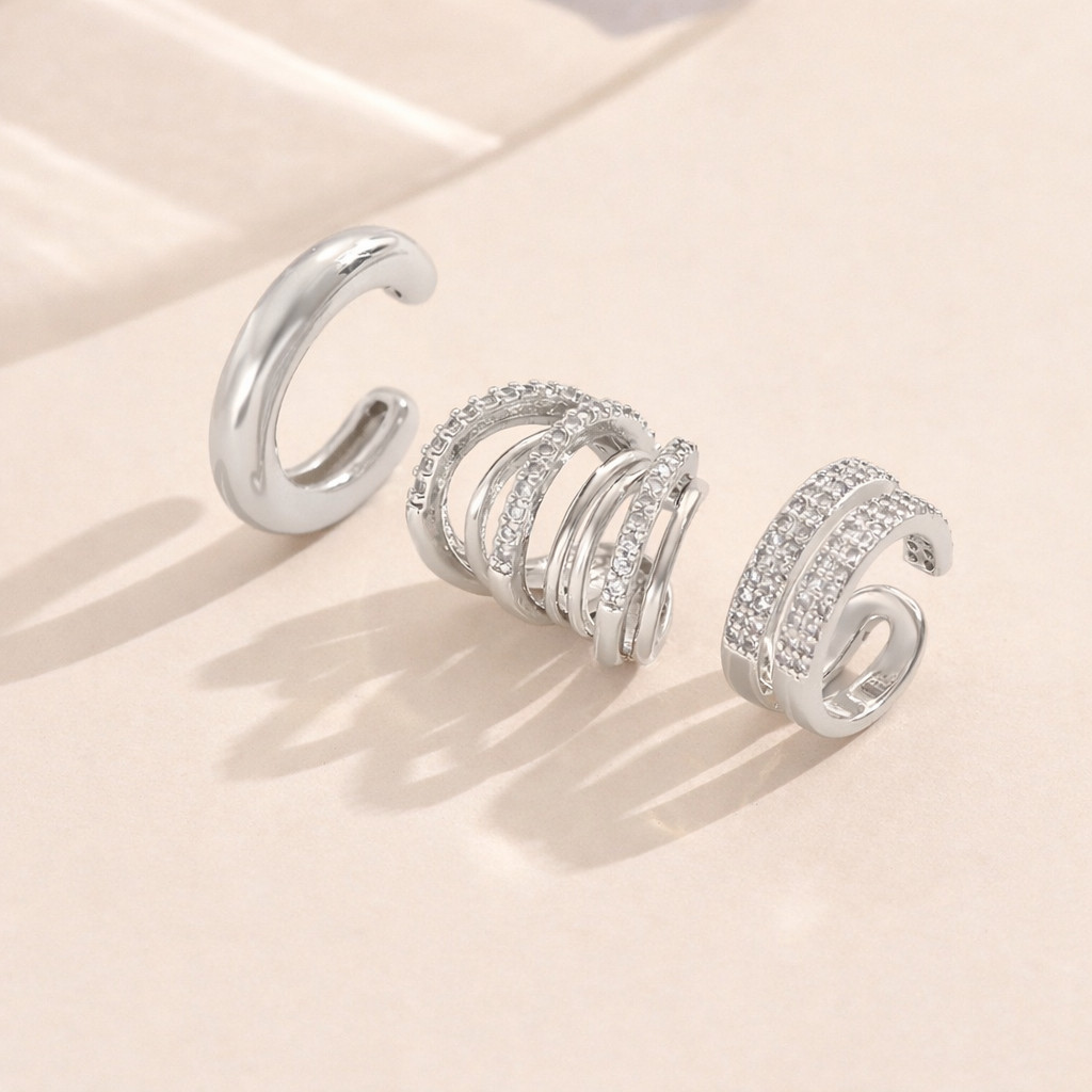 3 Piercing Fake de Orelha Delicado Prata925 Brincos de Pressão Conjunto da Moda Unissex Falso Cravejado Banhada Ouro 18k