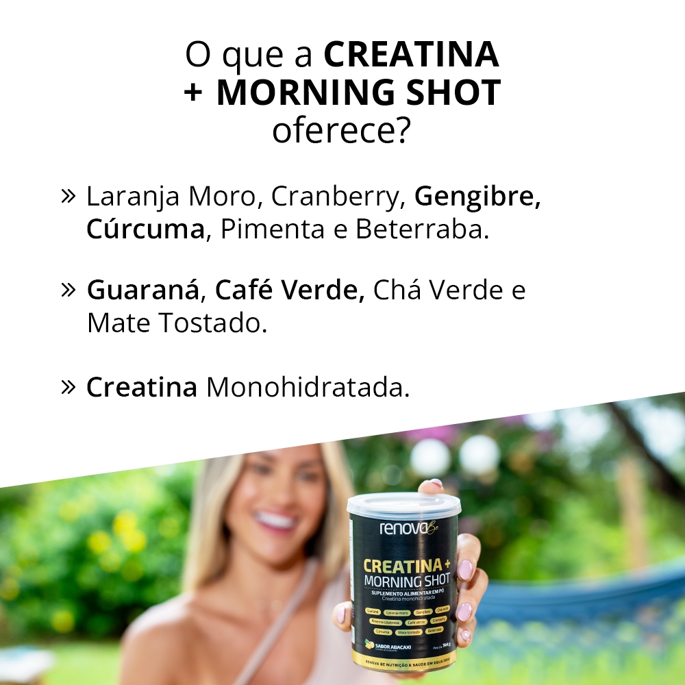 COMPOSTO POR 3 POTES DE CREATINA COM MORNING SHOT + HIDRATANTE LABIAL A Creatina + Morning Shot Renova be é um Shot Matinal de energia com 11 ativos poderosos com ação estimulantes e termogênicas, como creatina, gengibre e guaraná em pó, pensado para dar mais vida à sua rotina. A combinação exclusiva da Creatina com Morning Shot da Renova Be fornece os ativos necessários para promover mais disposição e desempenho durante as atividades físicas e do dia a dia. MODO DE USO: Basta misturar uma dose de Creatina + Morning Shot Renova Be em 200mL de água gelada. Como o nome sugere, tomar a Creatina + Morning Shot pela manhã é a opção mais recomendada. A creatina é mais eficaz quando consumida consistentemente, e tomar pela manhã pode ajudar a incorporar isso na sua rotina diária, ou pode ser consumida como pré-treino para aproveitar seus benefícios durante o exercício. Além de, ajudar a aumentar a força e a resistência nas atividades. INGREDIENTES: Guaraná em pó (Paullinia cupana), hibiscus em pó, beterraba em pó, cranberry em pó, extrato de café verde, mate tostado em pó, gengibre em pó, chá verde em pó, extrato de laranja moro (Citrussinensis (L.) Osbeck), pimenta calabresa vermelha, cúrcuma em pó, creatina monohidratada em pó, ácido cítrico (acidulante), aroma natural de abacaxi e sucralose (edulcorante). NÃO CONTÉM GLÚTEN. - Este produto é indicado para pessoas de 19 anos ou mais - Este produto não é um medicamento. Não exceder a recomendação diária de consumo indicada na embalagem. HIDRATANTE LABIAL CEREJA 15g Modo de uso: Aplique uma camada generosa nos lábios. Reaplique se for necessário. Precauções: Manter fora do alcance de crianças. Guardar em local seco e fora do calor excessivo. Em caso de irritação descontinue o uso.