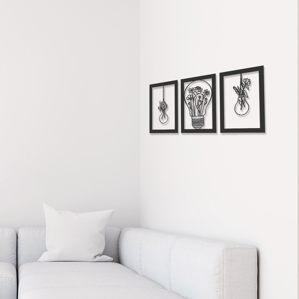 3 Quadros Decorativo Lâmpadas Florais MDF Preto Fosco