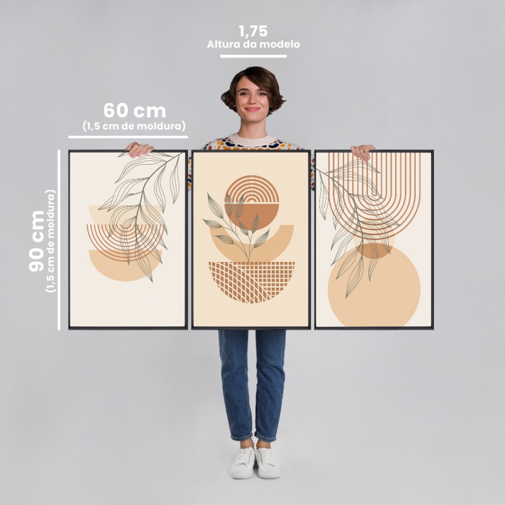 3 Quadros Decorativos Boho Abstrato Arte Geométrica Botânica com Moldura Sala Quarto Escritorio 50x75 e 60x90 com e sem vidro Conjunto em três peças de arte boho abstrata, apresentam um design minimalista com formas geométricas e elementos botânicos em tons de bege, marrom e laranja. O primeiro quadro à esquerda, exibe uma combinação de semicírculos e linhas curvas sobrepostas, com um desenho de folhas finas e alongadas que se estendem para fora das formas geométricas. O quadro central, apresenta uma composição de semicírculos e um padrão de linhas cruzadas, com um desenho de folhas que parecem crescer a partir das formas geométricas. No terceiro quadro à direita, mostra uma combinação de círculos e linhas curvas, com um desenho de folhas que se entrelaçam com as formas geométricas. Esse trio é interessante por sua estética moderna e minimalista, combinando elementos naturais com formas geométricas de maneira harmoniosa. As cores suaves e os desenhos simples tornam os quadros versáteis para diferentes tipos de decoração de interiores. Material da Imagem: Papel fotográfico premium. Material da Moldura: Madeira de reflorestamento revestida em preto. Dimensões: 60cm de largura e 90cm de comprimento. Acompanha: Suporte de serrilha Acabamento: Fita kraft. Destaques: Design atemporal, alta qualidade de imagem e moldura, certificado FSC de manejo florestal Material da Imagem: Papel fotográfico premium. Material da Moldura: Madeira de reflorestamento revestida em preto. Dimensões: 50cm de largura e 75cm de comprimento. Acompanha: Suporte de serrilha Acabamento: Fita kraft. Destaques: Design atemporal, alta qualidade de imagem e moldura, certificado FSC de manejo florestal