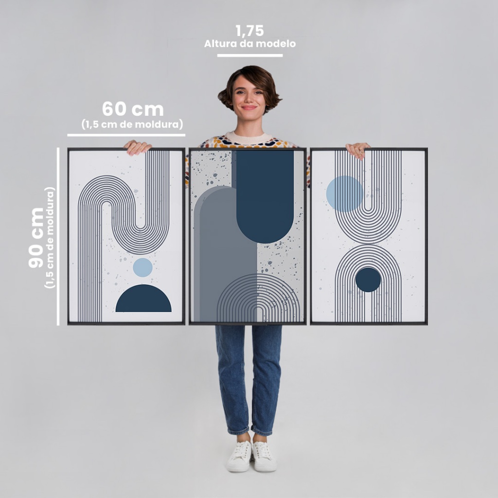 3 Quadros Decorativos Geométrico A Tranquilidade nas Formas com Moldura Sala Quarto Escritorio 50x75 e 60x90 com e sem vidro O conjunto de três peças de arte geométrica. As obras têm um estilo moderno e minimalista, a presença silenciosa das formas geométricas em tons de azul e cinza proporciona uma sensação de calma e introspecção, reflete a tranquilidade que as obras trazem ao ambiente. O primeiro quadro (à esquerda) apresenta linhas curvas paralelas que formam uma espécie de "U" invertido, com um círculo azul claro e uma forma semicircular azul escura na parte inferior. O quadro central, exibe formas geométricas sobrepostas, incluindo uma grande forma semicircular azul escura na parte superior e uma forma semicircular cinza claro na parte inferior. Linhas curvas paralelas se estendem a partir dessas formas. Já o terceiro quadro (à direita), mostra um padrão semelhante ao primeiro, com linhas curvas paralelas formando um "U" invertido, mas com um círculo azul claro maior e uma forma oval azul escura na parte inferior. O fundo de todos os quadros é claro com pequenas manchas cinza, adicionando um toque de textura ao design. Este conjunto de quadros é interessante por sua simplicidade e uso de formas geométricas e cores neutras, tornando-o adequado para uma decoração moderna e elegante. Material da Imagem: Papel fotográfico premium. Material da Moldura: Madeira de reflorestamento revestida em preto. Dimensões: 60cm de largura e 90cm de comprimento. Acompanha: Suporte de serrilha Acabamento: Fita kraft. Destaques: Design atemporal, alta qualidade de imagem e moldura, certificado FSC de manejo florestal Material da Imagem: Papel fotográfico premium. Material da Moldura: Madeira de reflorestamento revestida em preto. Dimensões: 50cm de largura e 75cm de comprimento. Acompanha: Suporte de serrilha Acabamento: Fita kraft. Destaques: Design atemporal, alta qualidade de imagem e moldura, certificado FSC de manejo florestal