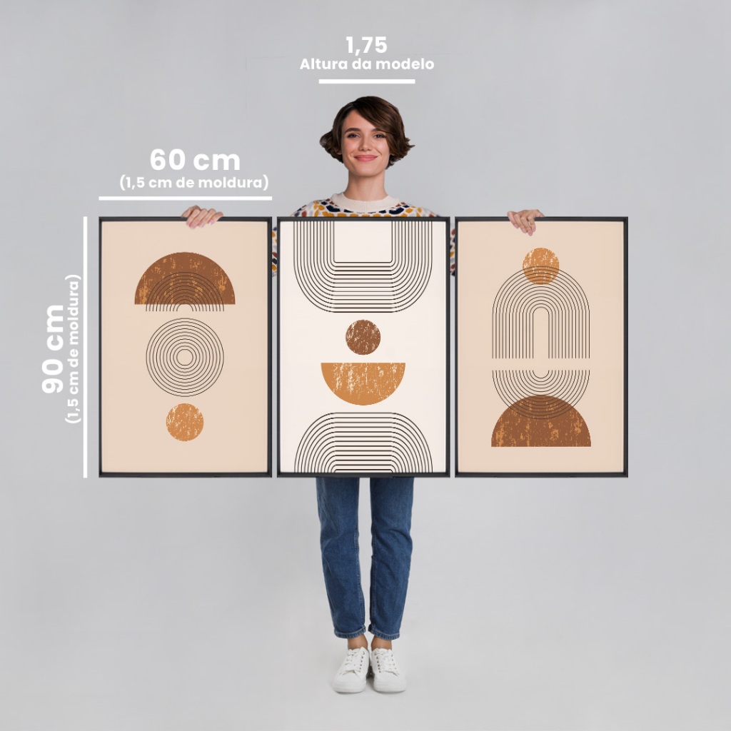 3 Quadros Decorativos Geométrico Tramas e Texturas Explorando a Geometria com Moldura Sala Quarto Escritorio 50x75 e 60x90 com e sem vidro Este conjunto de três quadros apresenta uma composição artística boho abstrata com formas geométricas em tons naturais e neutros. O primeiro quadro (à esquerda) exibe um semicírculo marrom texturizado na parte superior, seguido por um oval com linhas concêntricas pretas e um círculo marrom texturizado na parte inferior. Já o quadro central, apresenta um design com linhas pretas paralelas formando uma figura retangular na parte superior, um círculo marrom texturizado no centro e um semicírculo marrom texturizado na parte inferior. O terceiro quadro (à direita) mostra um arco com linhas concêntricas pretas na parte superior, um círculo marrom texturizado no centro e um semicírculo marrom texturizado na parte inferior. A combinação de formas simples e cores naturais cria uma sensação de harmonia e equilíbrio, tornando este conjunto uma peça interessante e relevante para a decoração de interiores modernos. Material da Imagem: Papel fotográfico premium. Material da Moldura: Madeira de reflorestamento revestida em preto. Dimensões: 60cm de largura e 90cm de comprimento. Acompanha: Suporte de serrilha Acabamento: Fita kraft. Destaques: Design atemporal, alta qualidade de imagem e moldura, certificado FSC de manejo florestal Material da Imagem: Papel fotográfico premium. Material da Moldura: Madeira de reflorestamento revestida em preto. Dimensões: 50cm de largura e 75cm de comprimento. Acompanha: Suporte de serrilha Acabamento: Fita kraft. Destaques: Design atemporal, alta qualidade de imagem e moldura, certificado FSC de manejo florestal