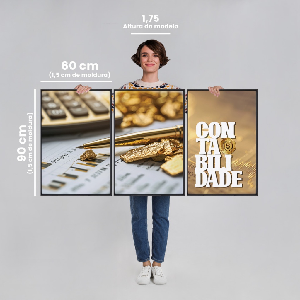3 Quadros Decorativos Profissão Contabilidade Triunfo Financeiro: Quadros de Análise e Riqueza com Moldura 50x75 e 60x90 com e sem Vidro Este conjunto de quadros consiste em três peças que, juntas, destacam a precisão e a prosperidade financeira. O primeiro quadro, posicionado à esquerda, apresenta uma imagem com uma calculadora desfocada no fundo. Em primeiro plano, há uma caneta dourada brilhante e várias pepitas de ouro espalhadas sobre um gráfico financeiro. A calculadora, embora desfocada, simboliza o processo meticuloso de cálculos financeiros e análises de dados, enquanto a caneta dourada representa a precisão e a importância de decisões financeiras bem fundamentadas. As pepitas de ouro simbolizam prosperidade e riqueza, sugerindo que análises financeiras cuidadosas podem resultar em sucesso financeiro. O gráfico financeiro ao fundo adiciona uma camada de seriedade e profissionalismo ao conjunto. O segundo quadro, ao centro, foca em uma caneta dourada, agora em destaque, colocada sobre uma série de documentos financeiros. Estes documentos incluem gráficos e tabelas que indicam a análise detalhada e a avaliação de dados financeiros. A presença das pepitas de ouro, novamente, reforça a ideia de que a precisão e o cuidado nos cálculos financeiros podem levar a resultados prósperos. A combinação de elementos sugere a dedicação e o esforço necessários para alcançar objetivos financeiros. A caneta dourada é um símbolo de luxo e sucesso, evocando uma sensação de ambição e realização. O terceiro quadro, à direita, destaca a palavra "CONTABILIDADE" em letras grandes e brancas, contrastando com um fundo dourado. Este design simboliza a importância e o prestígio da contabilidade no mundo dos negócios e das finanças. A escolha das cores, com o fundo dourado, reforça a ideia de riqueza e sucesso financeiro, enquanto as letras brancas são claras e diretas, transmitindo uma mensagem de clareza e precisão. Este quadro serve como um ponto focal na composição, resumindo os temas de precisão, análise e prosperidade que permeiam todo o conjunto. Esse conjunto de quadros seria ideal para um escritório de contabilidade, uma empresa de consultoria financeira ou qualquer ambiente profissional onde a ênfase na análise detalhada, precisão e sucesso financeiro é valorizada. A disposição harmoniosa dos quadros cria uma narrativa visual que inspira confiança e profissionalismo. Material da Imagem: Papel fotográfico premium. Material da Moldura: Madeira de reflorestamento revestida. Dimensões: 60cm de largura e 90cm de comprimento. Acompanha: Suporte de serrilha Acabamento: Fita kraft. Destaques: Design atemporal, alta qualidade de imagem e moldura, certificado FSC de manejo florestal Material da Imagem: Papel fotográfico premium. Material da Moldura: Madeira de reflorestamento revestida. Dimensões: 50cm de largura e 75cm de comprimento. Acompanha: Suporte de serrilha Acabamento: Fita kraft. Destaques: Design atemporal, alta qualidade de imagem e moldura, certificado FSC de manejo florestal