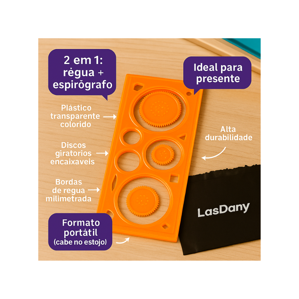 A Régua Mágica LasDany vai muito além de um brinquedo, ela é uma porta para a criatividade, a concentração e a conexão entre gerações. Com mais opções de desenhos e discos giratórios, ela transforma qualquer folha em uma obra de arte única. Uma atividade que tira as crianças das telas e aproxima pais e filhos em momentos de diversão real. Ideal para desenvolver a coordenação motora, estimular o foco e despertar a imaginação em qualquer idade, seja na escola, em casa, ou naquele tempinho de descanso. Leve, prática e irresistível. Para brincar, relaxar, competir ou simplesmente se encantar com o que sua mente é capaz de criar. Cód: E000000675 N°: 23393484625 Boas compras!!!