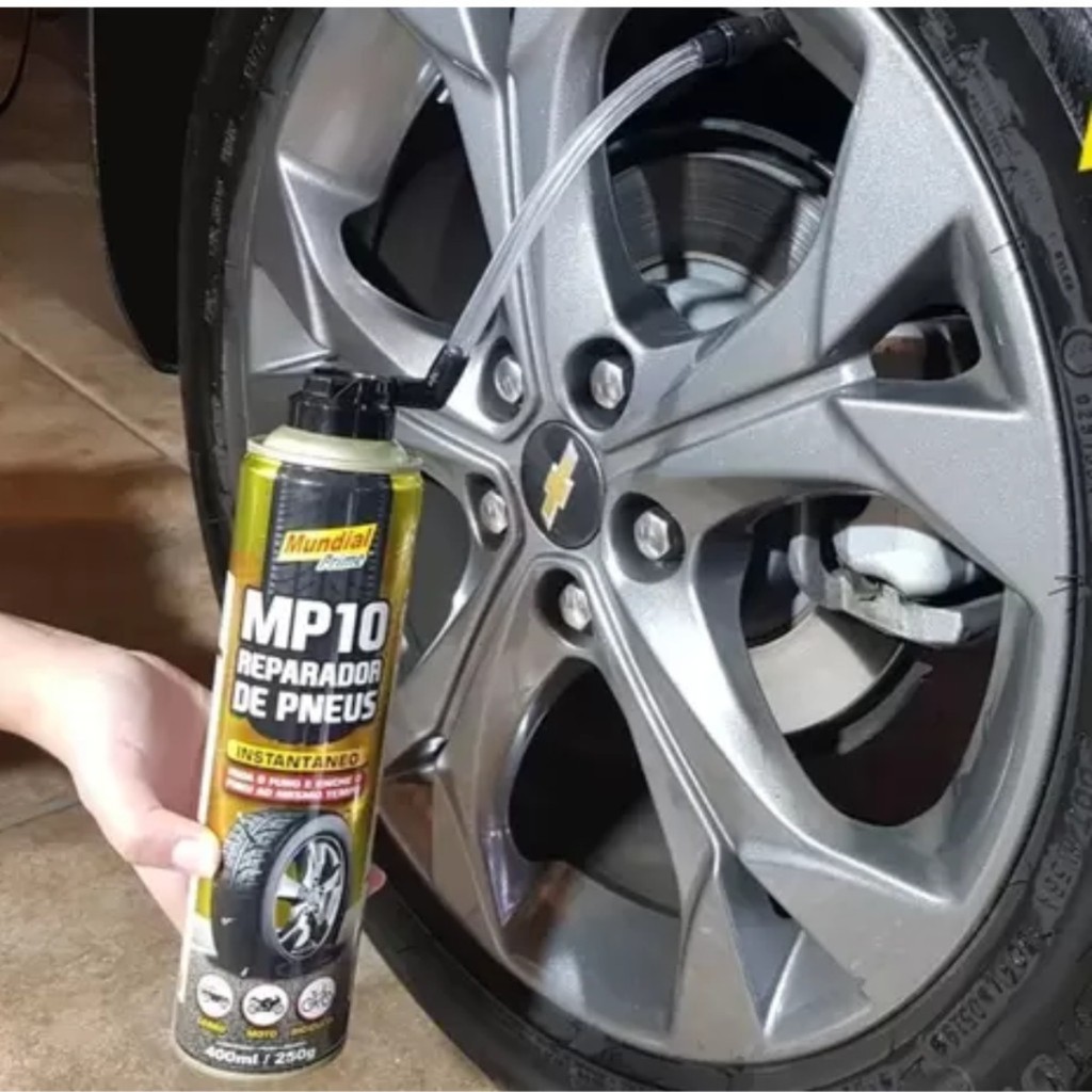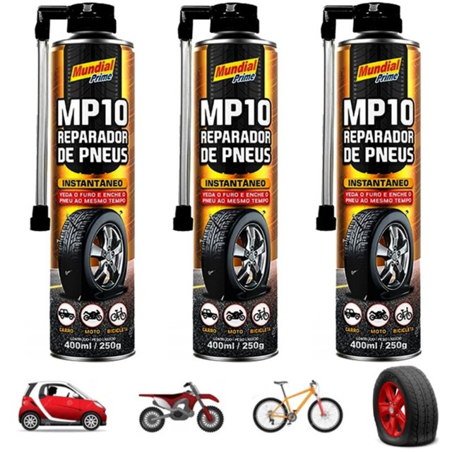 KIT 03 REPARADORES DE PNEUS INSTANTÂNEO MP10 MUNDIAL PRIME 400ML É um reparador de pneus instantâneo, que auxilia no reparo de pequenos furos e no enchimento do pneu em situações de emergência, no que se refere a pneu furado ou vazio em rodovias ou estradas que podem colocar em risco a segurança e conforto do condutor. - INDICADO PARA CARROS, MOTOS E BICICLETAS. - USE EM EMERGÊNCIA. - EVITA A TROCA. - PNEU COM CAMARA OU SEM CAMARA. - INSTANTÂNEO. - VEDA O FURO E ENCHE O PNEU AO MESMO TEMPO. Modo de Utilização • 1 - Agite bem antes de usar. Remova a capa protetora e rosqueie a ponta do aplicador na válvula do pneu. A lata deve ser utilizada sempre na posição vertical. Este produto pode não ter seudesempenho ideal em caso de rasgos nos pneus ou furos de grande dimensão, ou mesmo pneus que estejam em mau estado de conservação ou danificados • 2 - Acione a válvula do produto, pressionando-a de forma que o conteúdo se transfira para o pneu, agitando a lata de vez em quando. Continue até que este aparente estar cheio. Desrosqueie a ponta do aplicador e tampe a válvula do pneu rapidamente Para pneus com câmara, recomenda-se puxar a válvula do pneu para evitar que o produto escape antes que a câmara fique totalmente cheia. • 3 - Imediatamente, coloque o veículo em movimento, em velocidade baixa, de forma que o produto se espalhe uniformemente pelo interior do pneu. Evite dirigir em alta velocidade ou realizar manobras bruscas. Dirija-se imediatamente ao posto ou mecânico mais próximo a fim de realizar o conserto definitivo do pneuImportante: Avise o profissional que este produto foi utilizado e advirta-o para não produzir ou evitar realizar o trabalho em locais onde possa haver faíscas ou fogo durante o concerto