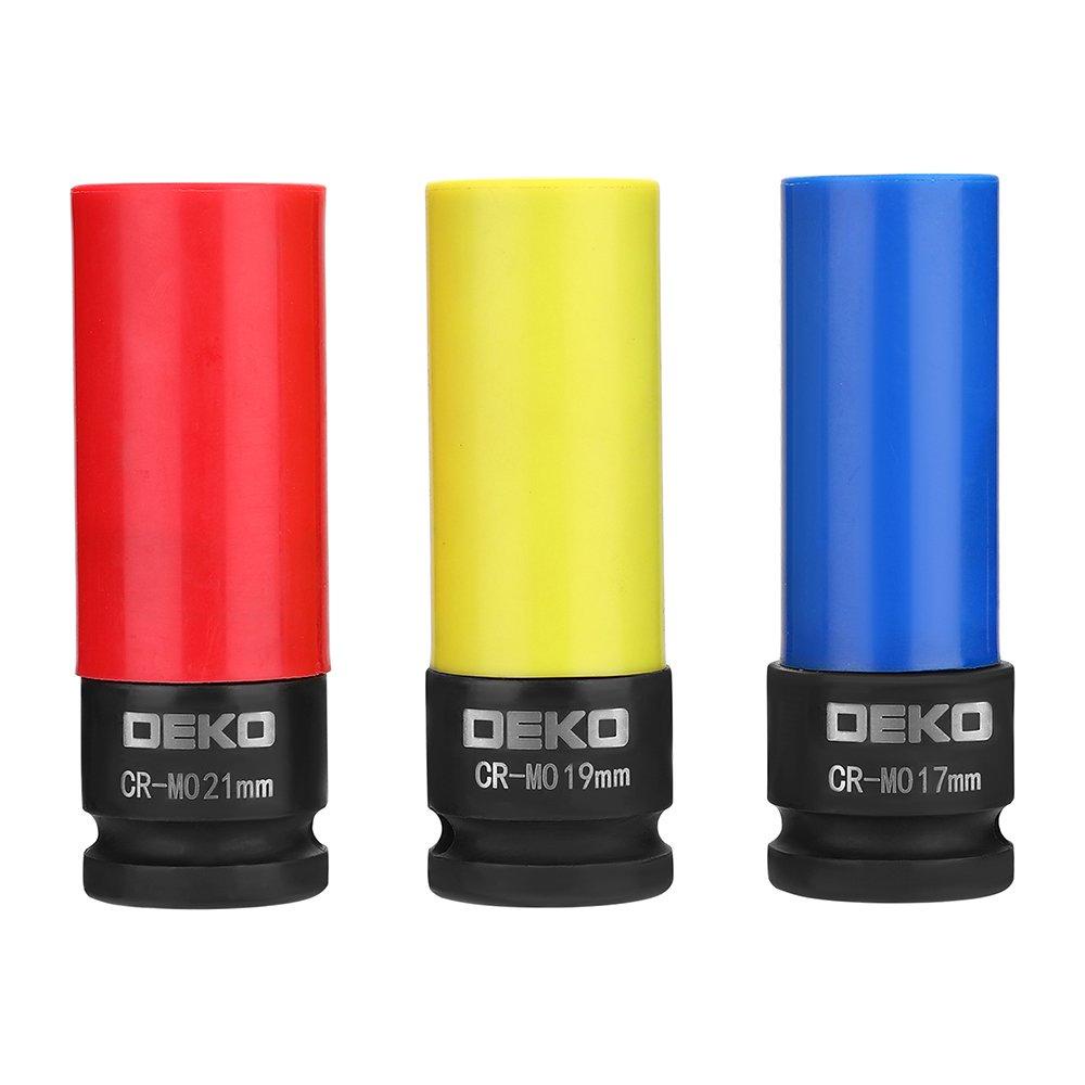 Jogo de soquete de impacto é ideal para a montagem e desmontagem em rodas de liga leve. Possui acabamento colorido e tratamento em Cromo Molibdênio para trabalhar sem danos às rodas. Fabricado em material de alta qualidade, proporcionando durabilidade e resistência. - Especificações Técnicas: :: Encaixe: 1/2"" :: Medidas: 17, 19, 21mm :: Material: cromo molibdênio :: Comprimento: 86mm :: Dimensões: 14.5 x 6 x 16.3cm :: Peso: 700g - Conteúdo da Embalagem: :: 3 Soquetes :: Maleta de Acondicionamento - Garantia: 1 Ano - Código de Barras: 7908591702910 Ref.: DEKO-DKA10ST-3 Marca.: DEKO