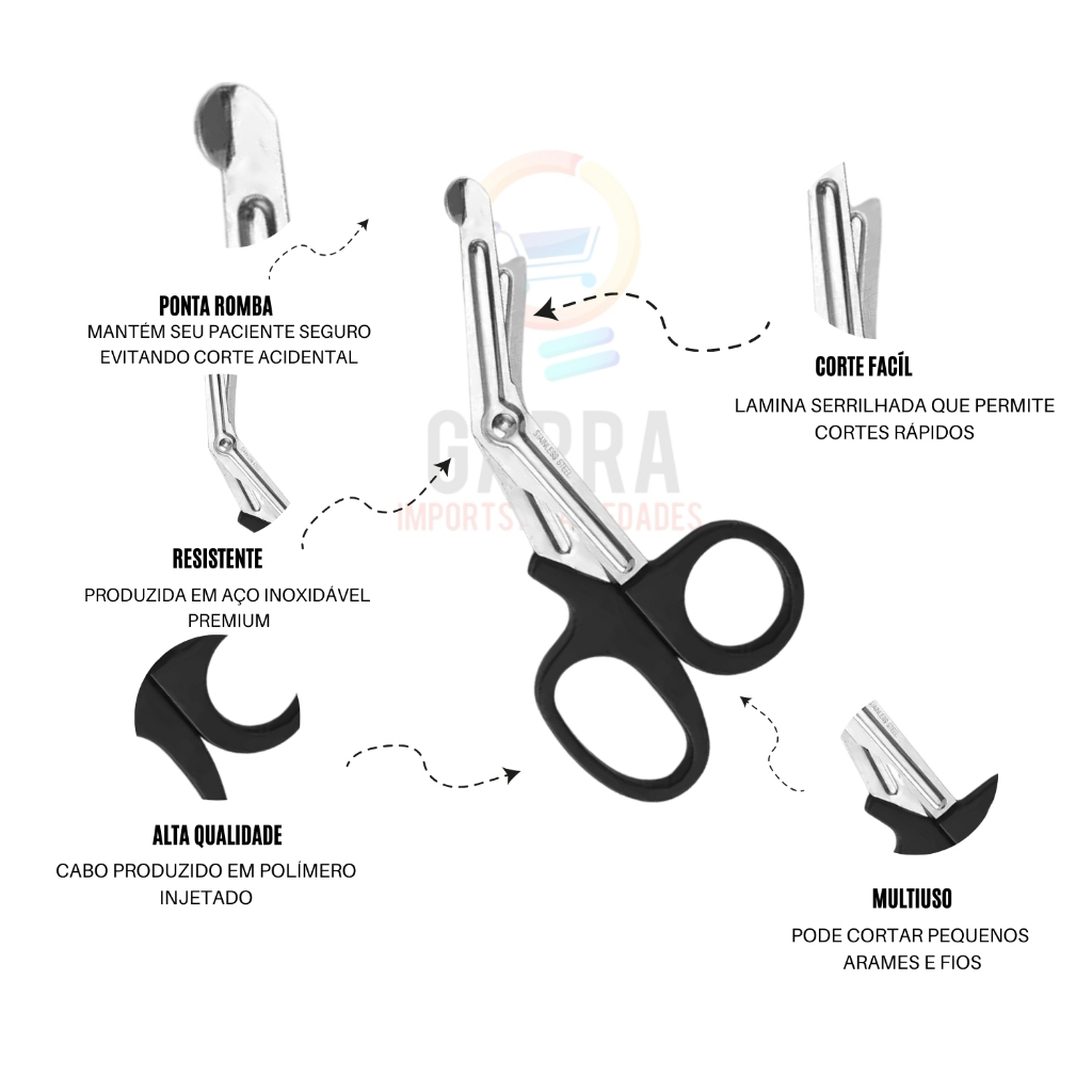 Tesoura ponta romba Aph tático primeiros socorros emergência resgate Amplamente utilizada por bombeiros militares e civis, socorristas, profissionais do SAMU, Aph tático, uso hospitalar e resgate de feridos em geral. Especificações técnicas: Feita em aço inoxidável e cabo em propileno: Proporciona pegada ergonômica e de fácil manuseio Possui superfícies como dente serrilhado e orifício próximo ao cabo que possibilitam cortar diferentes tecidos, inclusive mais espessos, além de fios de fios poucos espessos A ferramenta ideal para profissionais de resgate, possibilita inclusive o corte de cinto de segurança. Dimensões: 15 cm/ 5,5 / 1 cm O pacote inclui: 03 Tesouras Ponta romba ----------------------------------------------------------------------------------------------------------------------------------- PERGUNTAS FREQUENTES: ----------------------------------------------------------------------------------------------------------------------------------- 1 - A tesoura é confeccionada com qual material? R - Aço inoxidável. 2 - Qual o tamanho da tesoura? R - 15,5cm 3 - Emite NFe? R- Sim, emitimos NF para todos os pedidos. 4 - Envio imediato? R - Sim