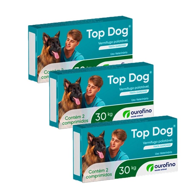 3 Top Dog 30kg Vermifugo Ouro Fino 2 Comprimidos Cada Caixa - Indicado para cães; - Vermífugo palatável; - Combate e controlea os parasitas internos; - Auxilia no tratamento da giardíase. O Top Dog Combate vermes redondos, vermes chatos e trata a giardíase. O Vermífugo vem com sabor que os cães adoram. Indicações Top Dog é um vermífugo palatável, indicado para o combate e controle de parasitas internos (helmintos) de cães com atuação em vermes redondos (nematódeos) e vermes chatos (cestódeos). Top Dog é também indicado para o tratamento da Giardíase (causada pelo protozoário Giardia sp). Espectro de ação de Top Dog Nematódeos Ancylostoma caninum, Toxocara canis. Cestódeos Dipylidium caninum. Protozoários Giardiasp. Fórmula Apresentação de 3000 mg Praziquantel .......... 150 mg Pamoato de Pirantel .......... 432 mg Febantel .......... 450 mg Ivermectina .......... 0,18 mg Excipiente q.s.p ........... 3000 mg Modo de Usar e dosagem Top Dog (3000 mg) Administrar pela via oral 1 comprimido palatável para cada 30 kg de peso corporal. Esta dose corresponde a 14,4 mg/kg de peso corporal de Pamoato de Pirantel , 5 mg/kg de peso corporal de Praziquantel , 15 mg/kg de peso corporal de Febantel e 0,006 mg/kg de peso corporal de Ivermectina. Precauções, contraindicações, limitações de uso, interações medicamentosas e reações adversas podem ser encontradas no site do fabricante ou na bula do medicamento. Top Dog é um medicamento e deve ser usado conforme prescrição do médico-veterinário.